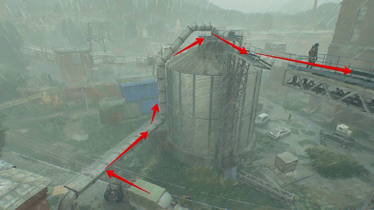 Перетніть водойму за допомогою підвісного зеленого контейнера. Залізьте на найближчий дах і через стрічковий транспортер потрапте на завод. Спустіться на перший поверх і в кінці палетів з цеглою огляньте вузький прохід.