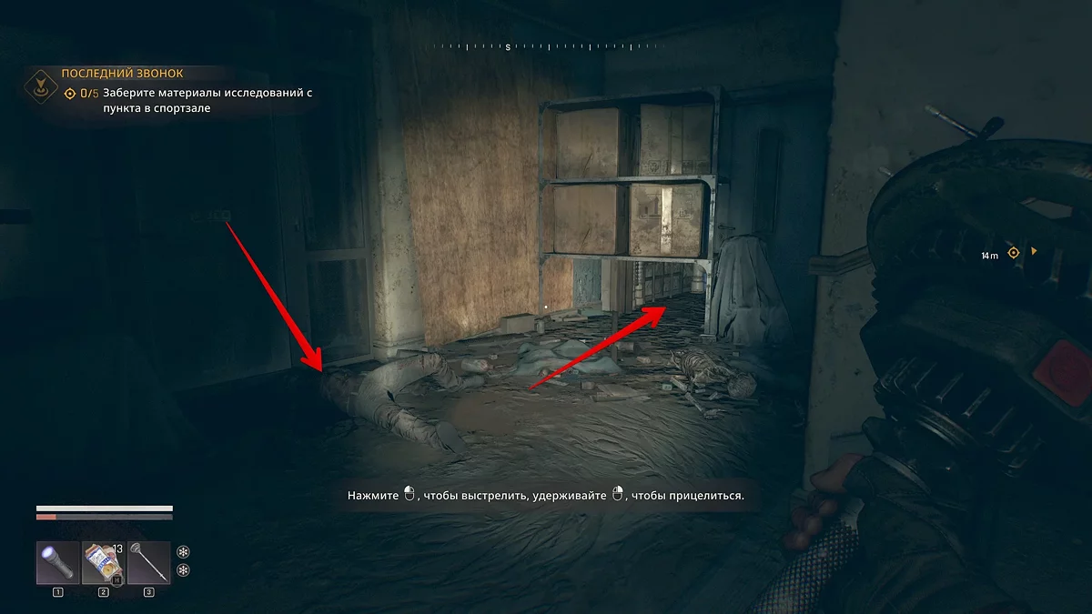 Пройдіть під столом, вбийте ззаду зараженого зліва і пролізьте в наступну кімнату. Попереду буде довгий коридор, по якому бродить стрибун.