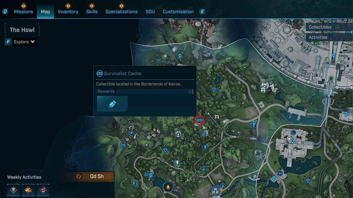 П’ятий тайник виживших захований в амбарі на холмі в регіоні The Howl. Щоб знайти його, вам потрібно буде увійти в печеру, розташовану на південному сході від іконки тайника на карті. Всередині печери вам потрібно буде використовувати гак, щоб піднятися вгору, а потім перебратися через скелі до бічної камери з хатиною. Тайник буде знаходитися прямо біля хатини.