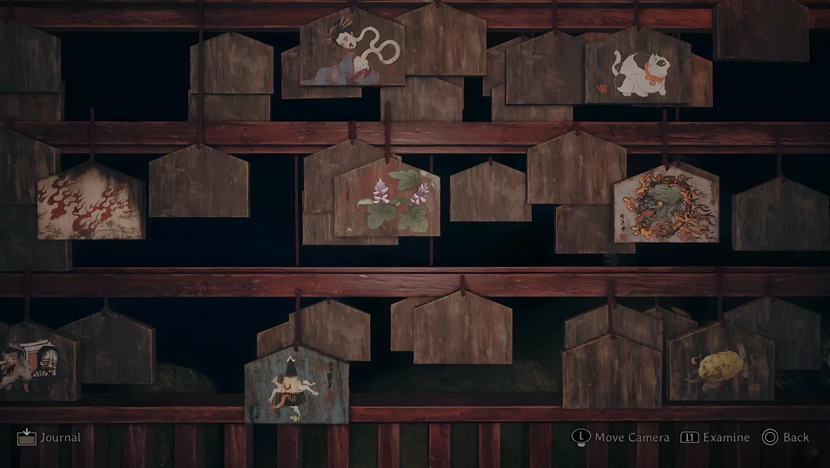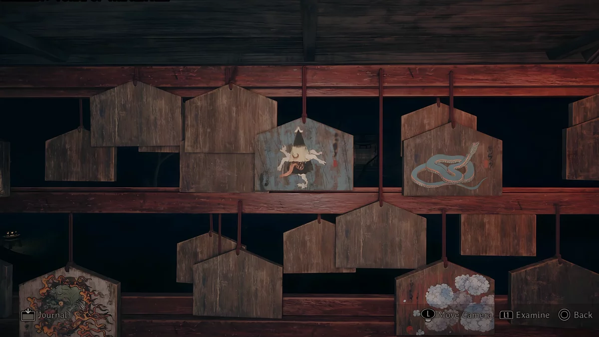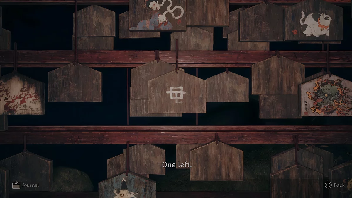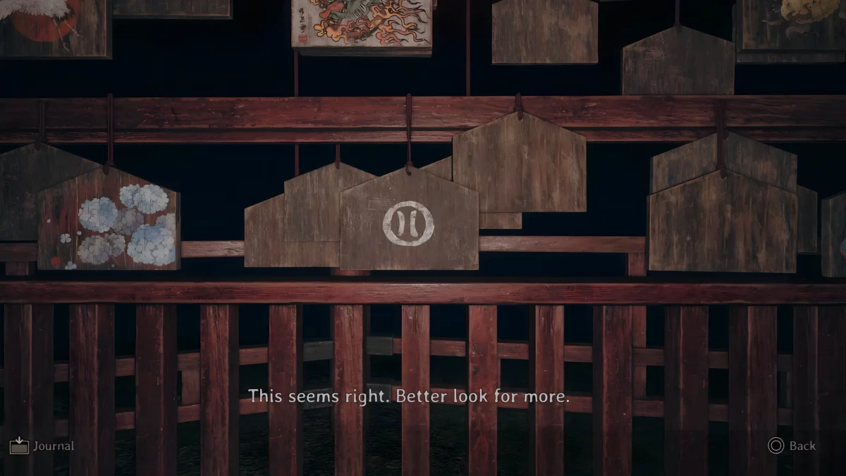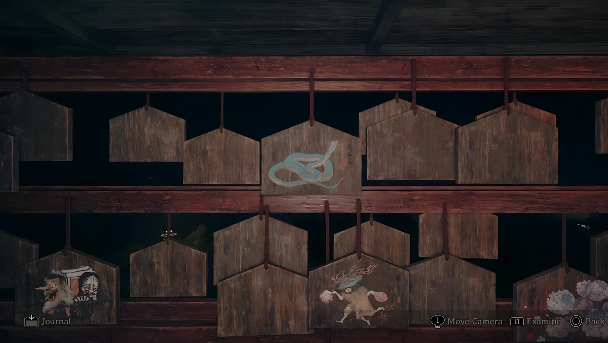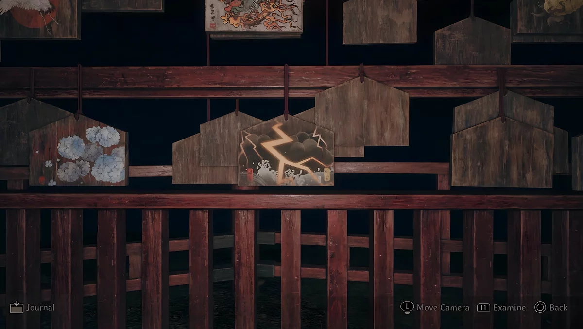 У темному святині є три зони, де стоять стенди, на яких висять дощечки ема. На пластинах намальовані зображення, а на зворотному боці написані певні символи. Щоб зрозуміти, які шукати дощечки, потрібно прочитати текст, написаний на листку, що лежить поруч з лялькою.