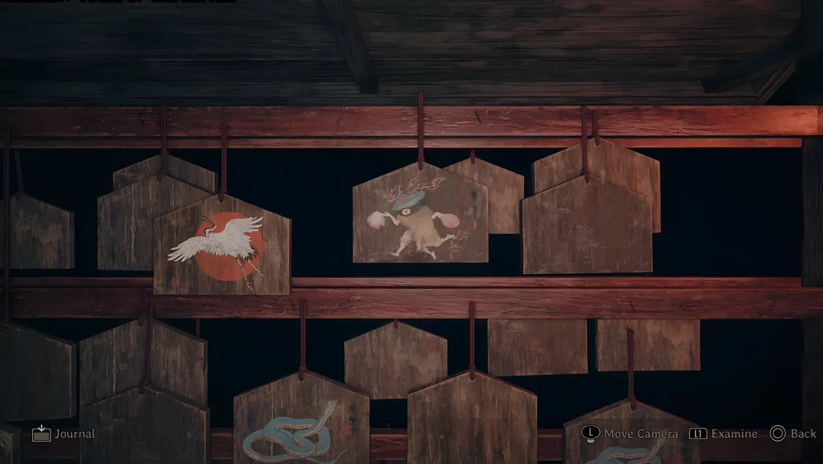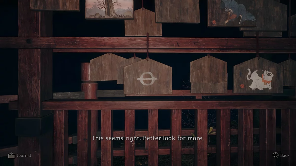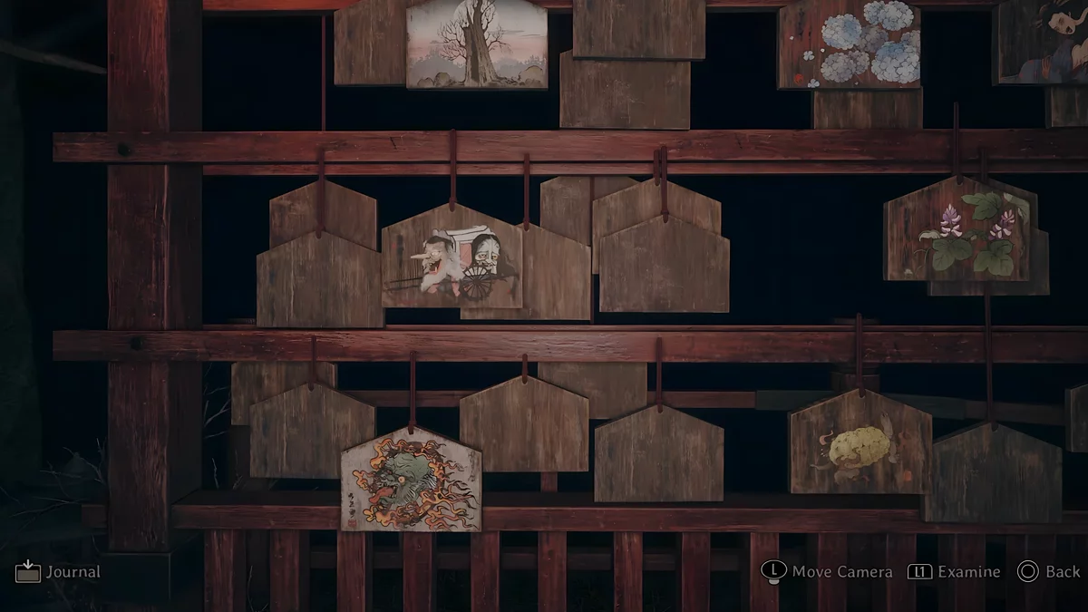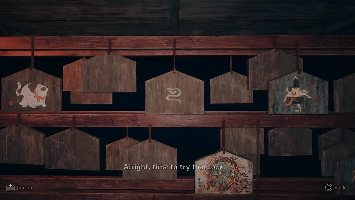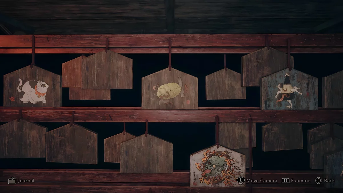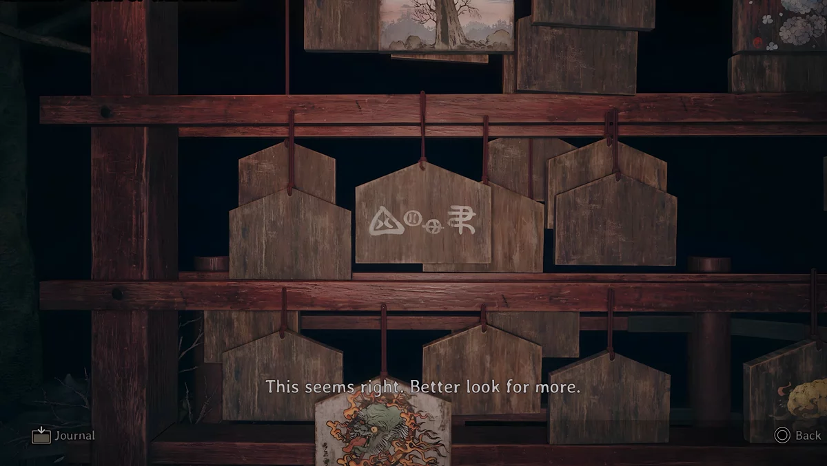 У темному святині є три зони, де стоять стенди, на яких висять дощечки ема. На пластинах намальовані зображення, а на зворотному боці написані певні символи. Щоб зрозуміти, які шукати дощечки, потрібно прочитати текст, написаний на листку, що лежить поруч з лялькою.
