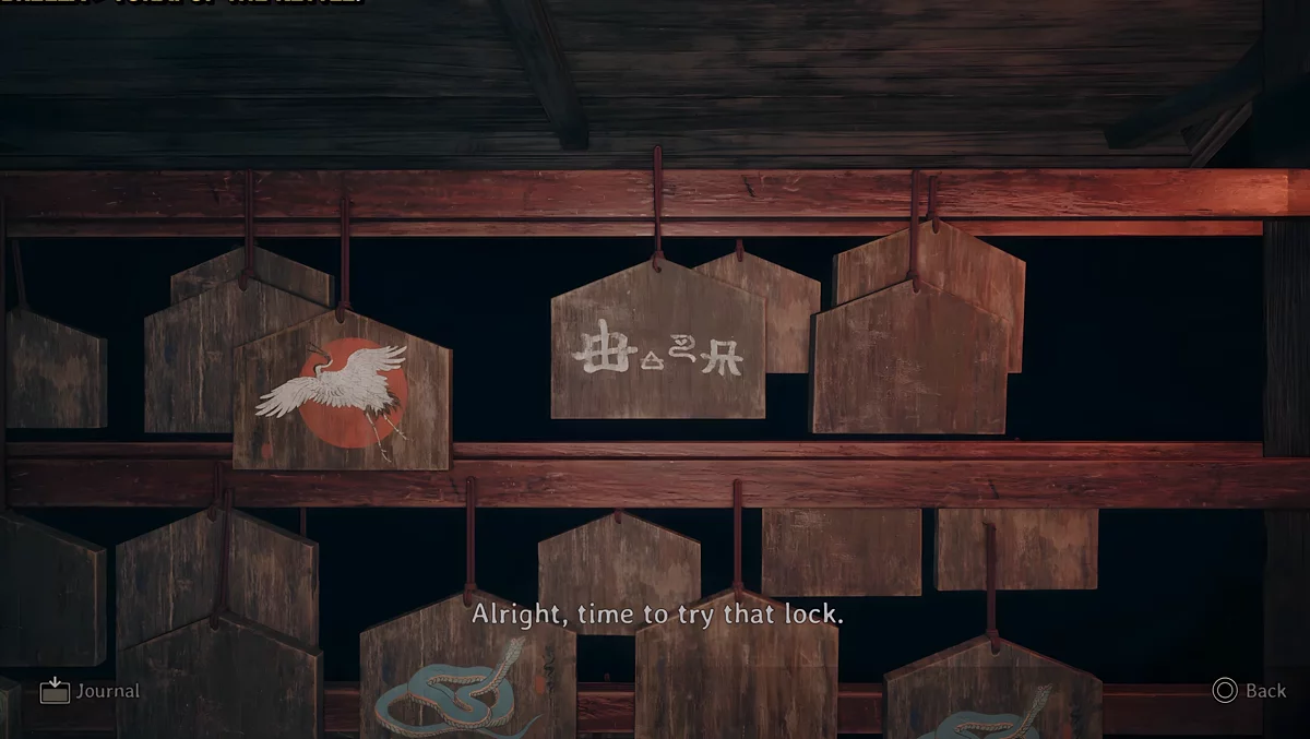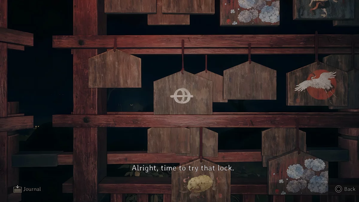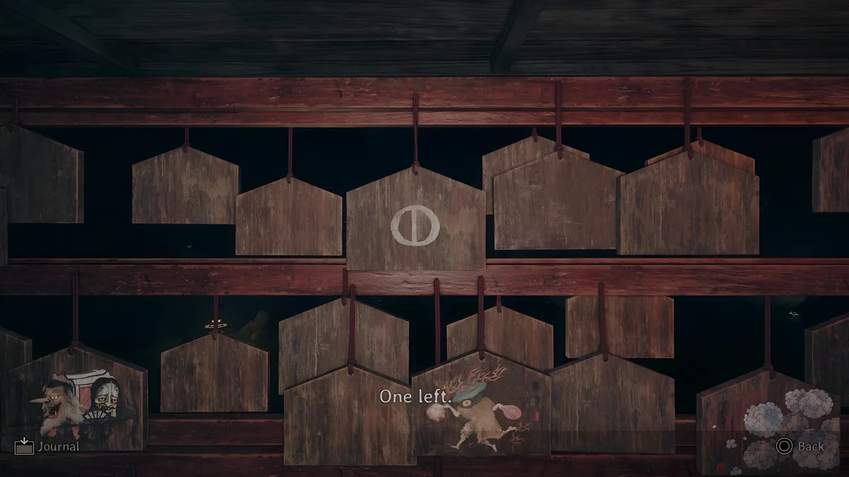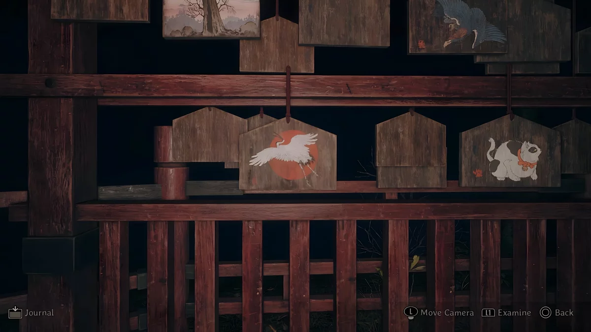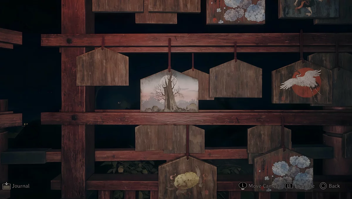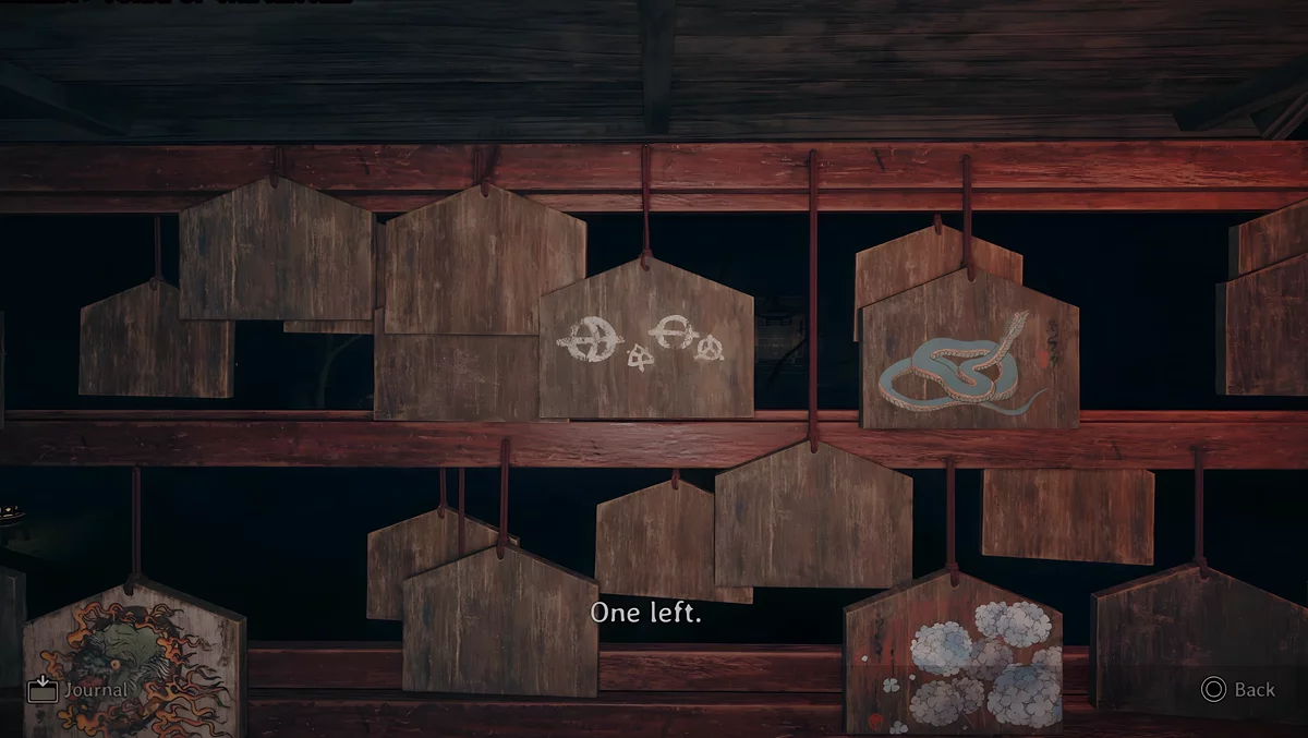 У темному святині є три зони, де стоять стенди, на яких висять дощечки ема. На пластинах намальовані зображення, а на зворотному боці написані певні символи. Щоб зрозуміти, які шукати дощечки, потрібно прочитати текст, написаний на листку, що лежить поруч з лялькою.