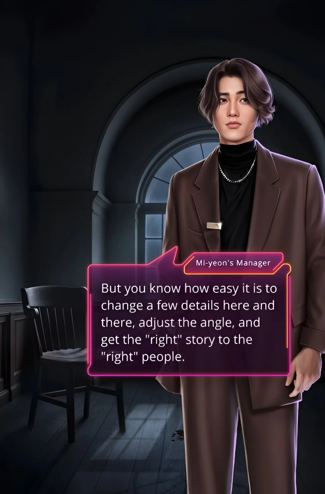 Ви спробували вибратися, але пан Нам схопив за горло. Коли його пальці розтиснулися, пролунали крики Діна, який просив бігти без огляду. Ваша героїня кинулася геть усіма ногами. З клубу вона потрапила в ресторан, де її зустрів менеджер Міён. Чоловік заявив, що хоче поговорити.