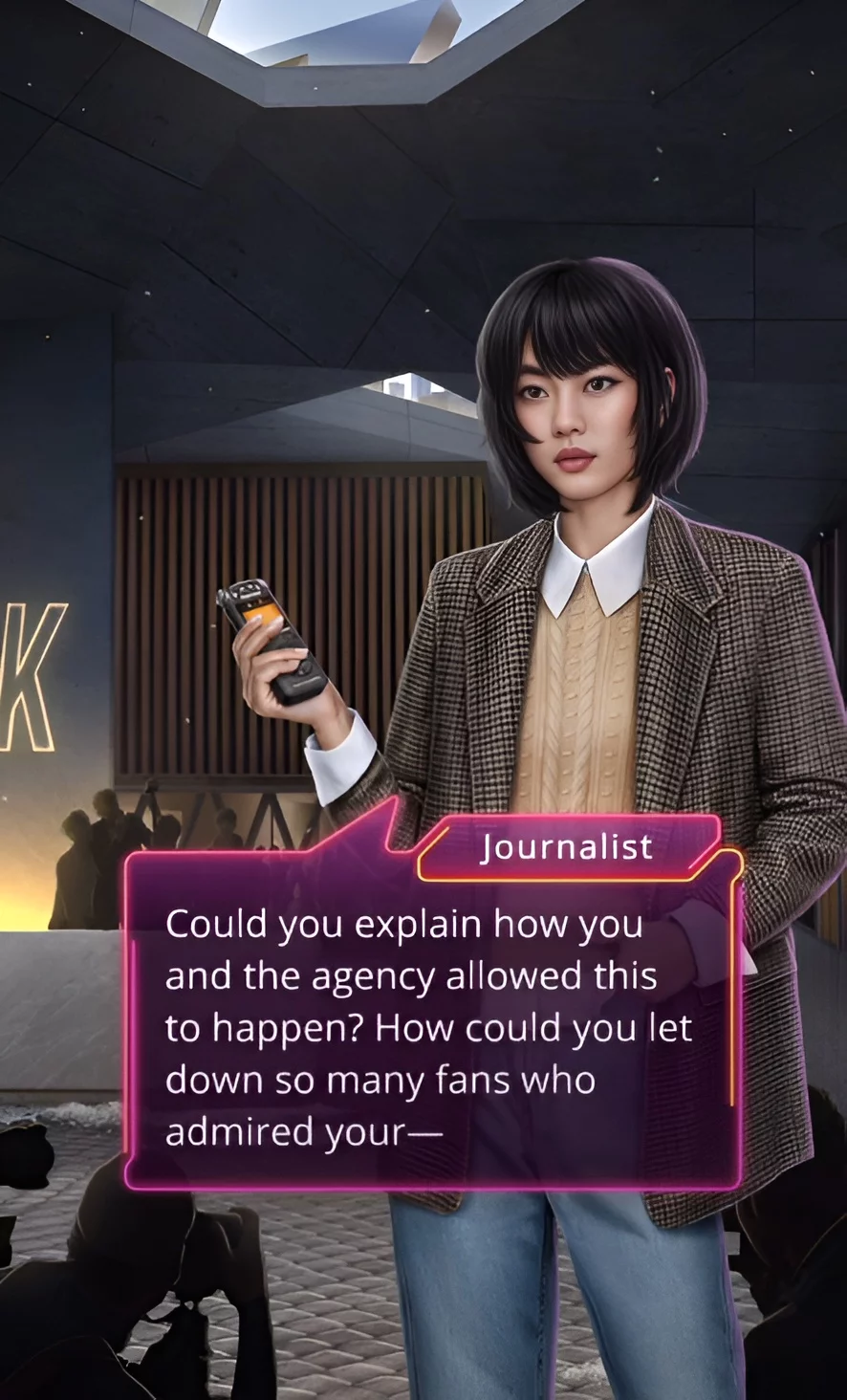 До вас підійшов Кас і запитав, чи готова ваша героїня. Все йде за планом — Дін дав шокуюче інтерв’ю, від якого менеджер його групи ледь трималася на ногах. Ситуацію у своєму стилі прокоментував Мінхьок. При цьому поет підтримав хлопця і похвалив його за сміливість. По-перше, серед усієї юрби є людина, яка записує все, що відбувається.