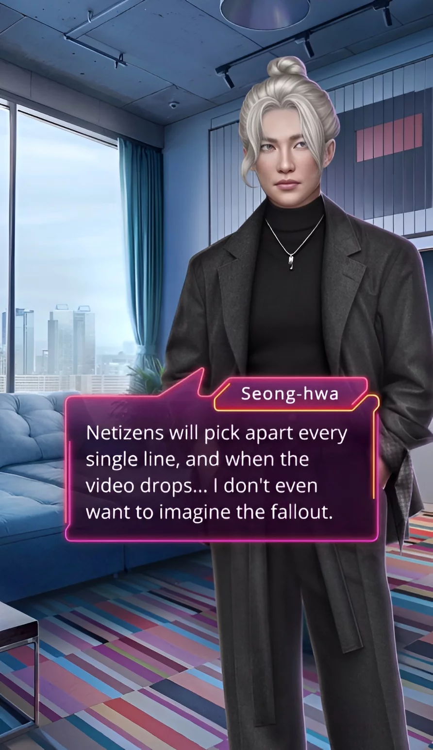 Ви вирішили пригостити артиста і його менеджера смачною кавою. Під час повернення в кабінет з чотирма стаканчиками ваша героїня помітила наставника. Проскочити повз не вдалося, Донхьон почав розмову. У його словах були докори за добре ставлення до Мінхьока. Ви ж у відповідь натякнули на те, що він помирився з паном Кімом. Хлопець сказав, що йому доводиться бути люб’язним.