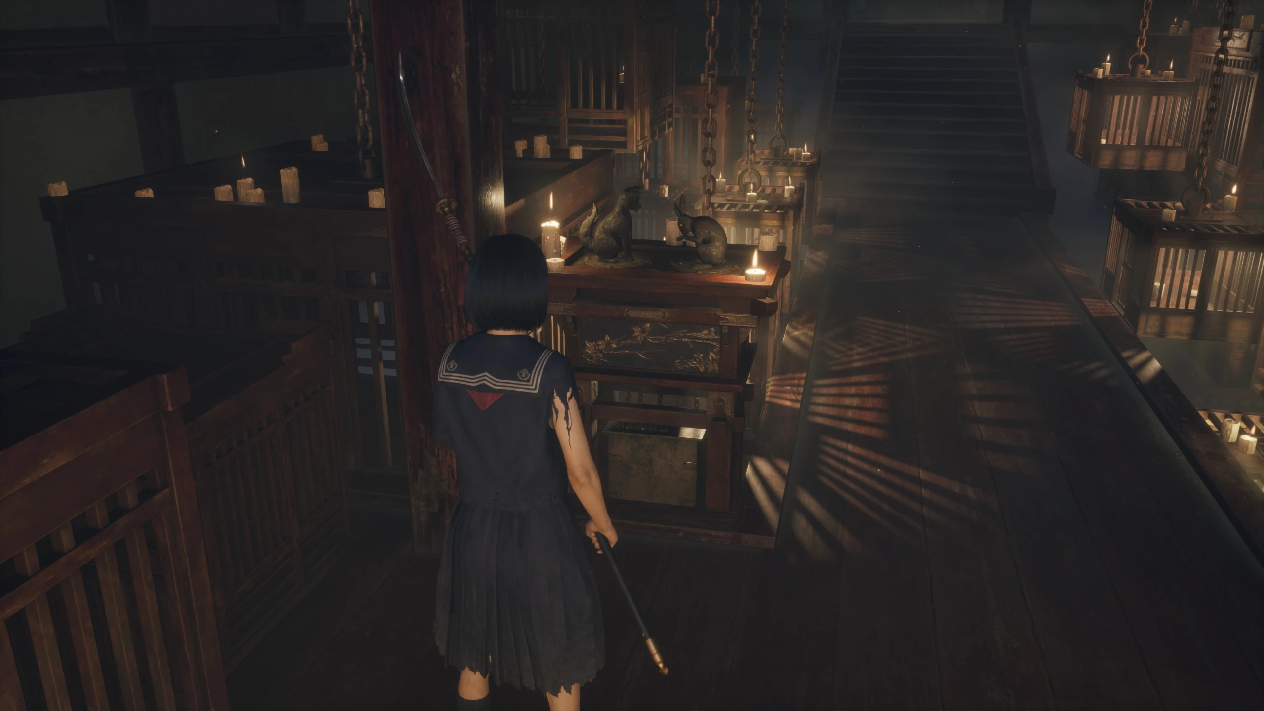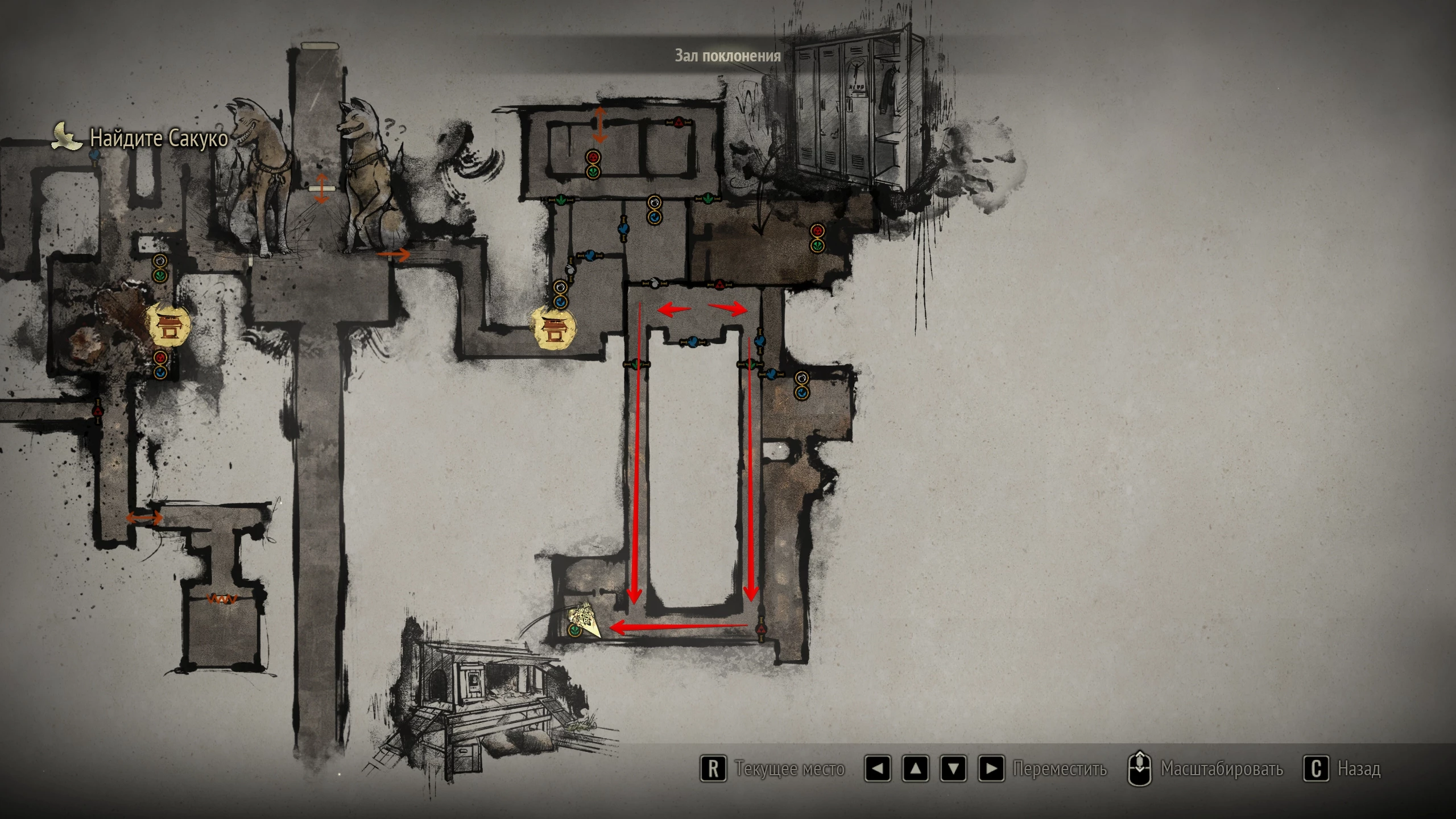 Якщо ви вже пройшли зал поклоніння Рінко, то спочатку потрібно вставити ключ з емблемою-вагами в замкову щілину під статуєю Інарі зліва від зв'язаної двері. Потім активуйте монумент справа, щоб відкрити секцію Сасуко.