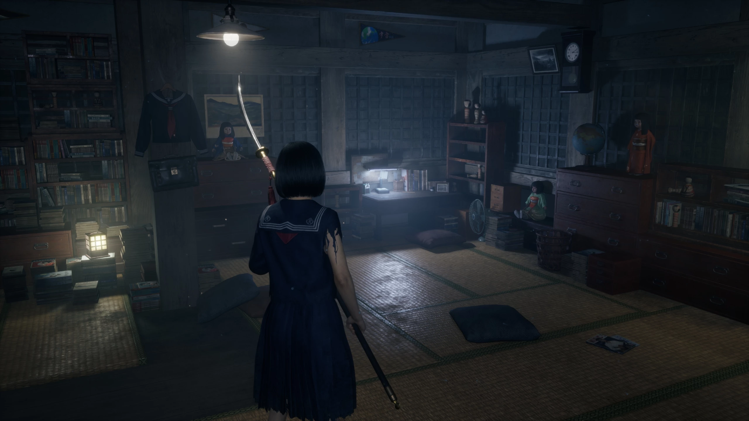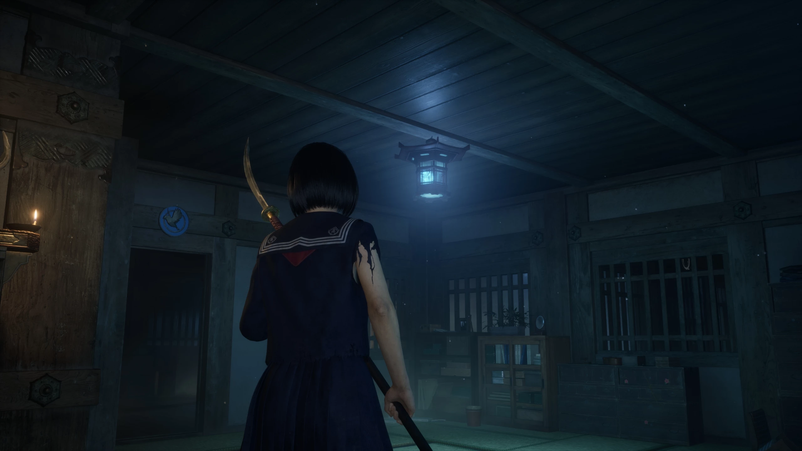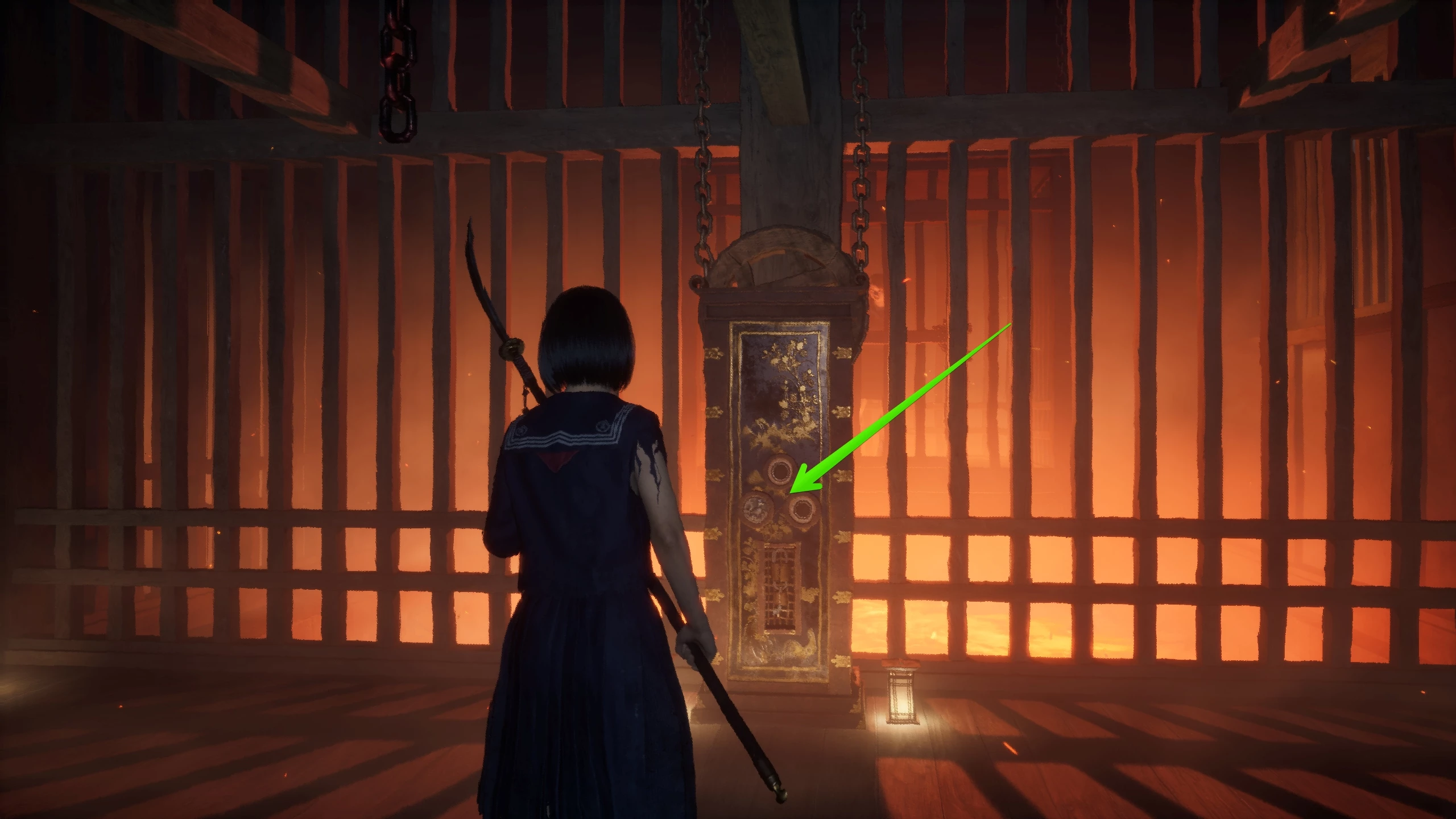 Знайдіть ляльку в зеленому кімоно. Вона сидить на комоді поруч з червоним ліхтариком зліва від ліжка. За нею знаходиться герб з лисом, що дивиться вправо. Вийдіть з кімнати і потрапите в головний зал. Зверніть увагу, що в коридорі зліва чекає монстр.