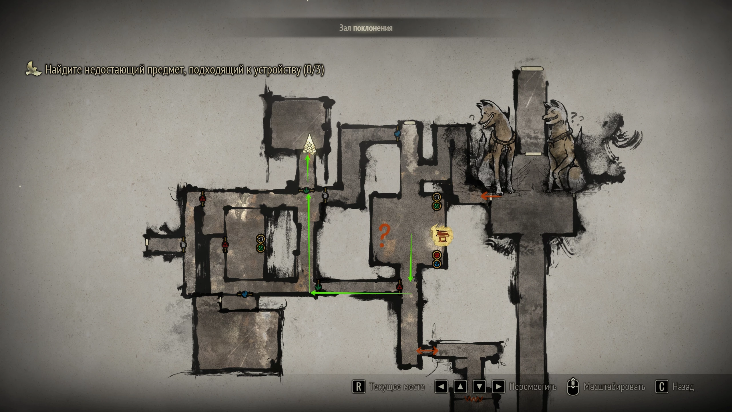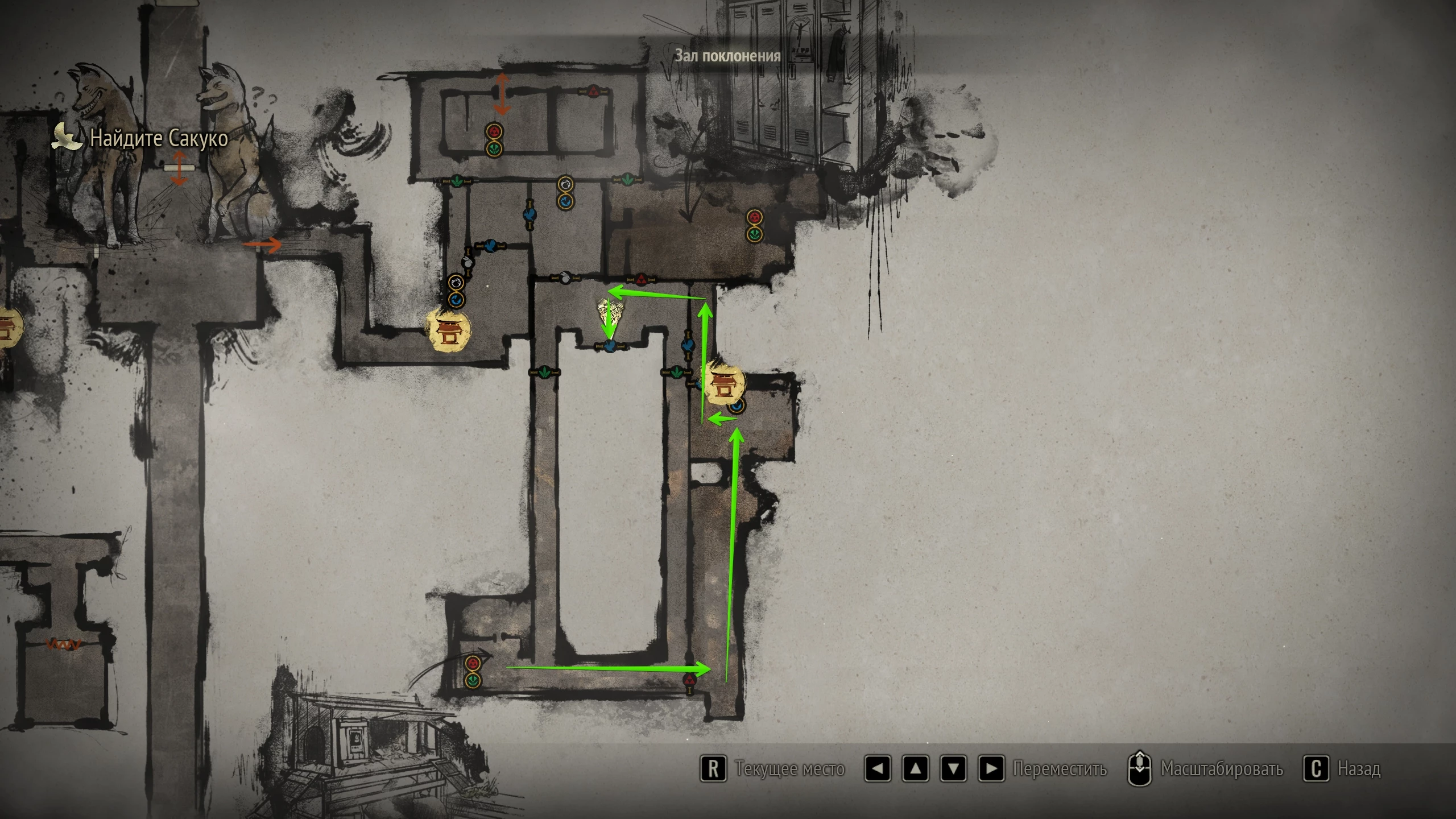 Підійдіть до статуї лисиці зліва від вівтаря і переключіть її в положення «зелений лист». Тепер увійдіть у коридор за спиною і пройдіть через червоні ворота зліва. На першому повороті поверніть направо і рухайтеся вперед, поки не натрапите на двостулкові двері з синьою смужкою по центру.