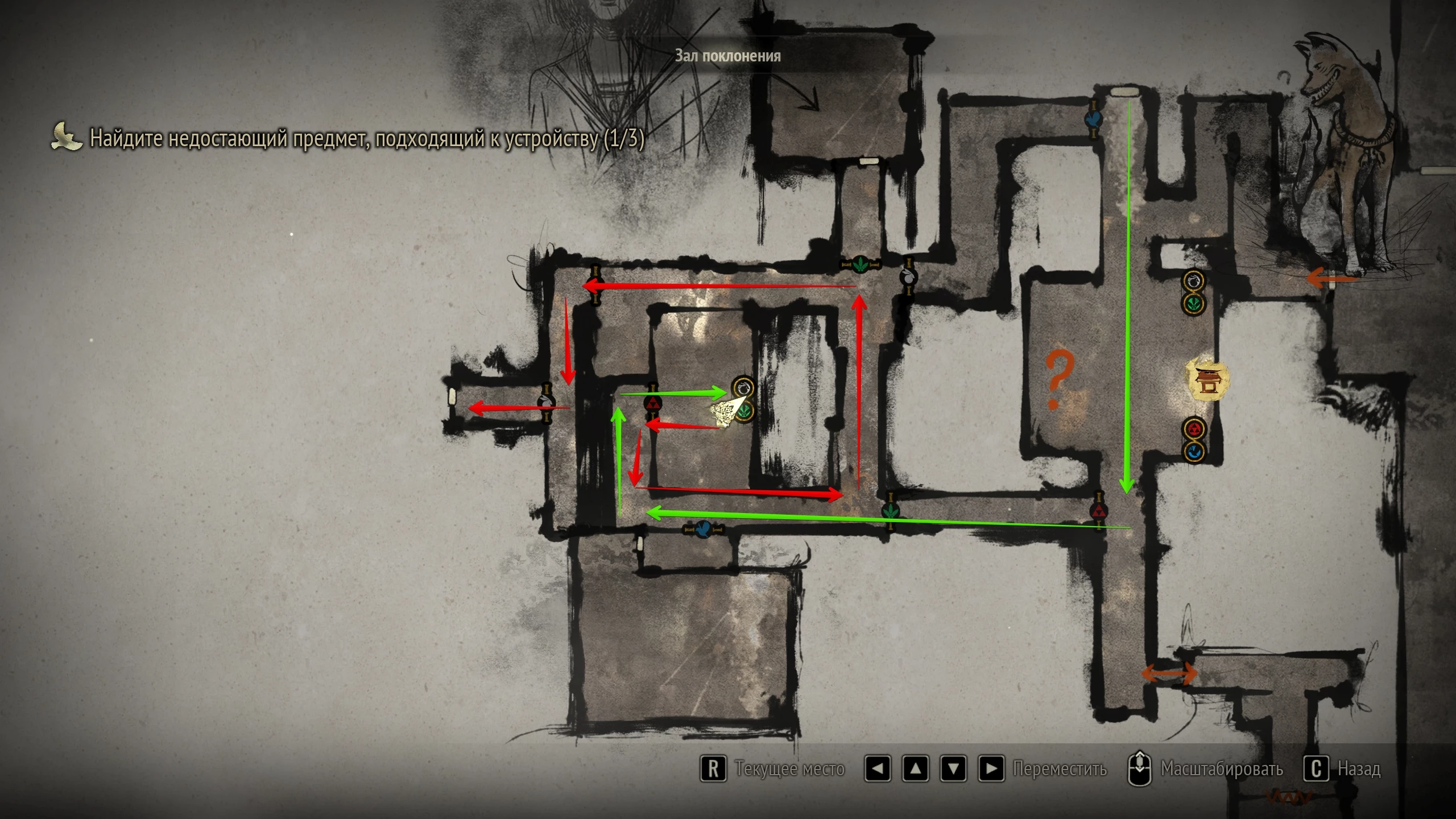 Покиньте зал, поверніть наліво і зайдіть у коридор зліва. Таким чином ви опинитеся в першому приміщенні. За допомогою статуй вийдете до холу з двома зеленими воротами.