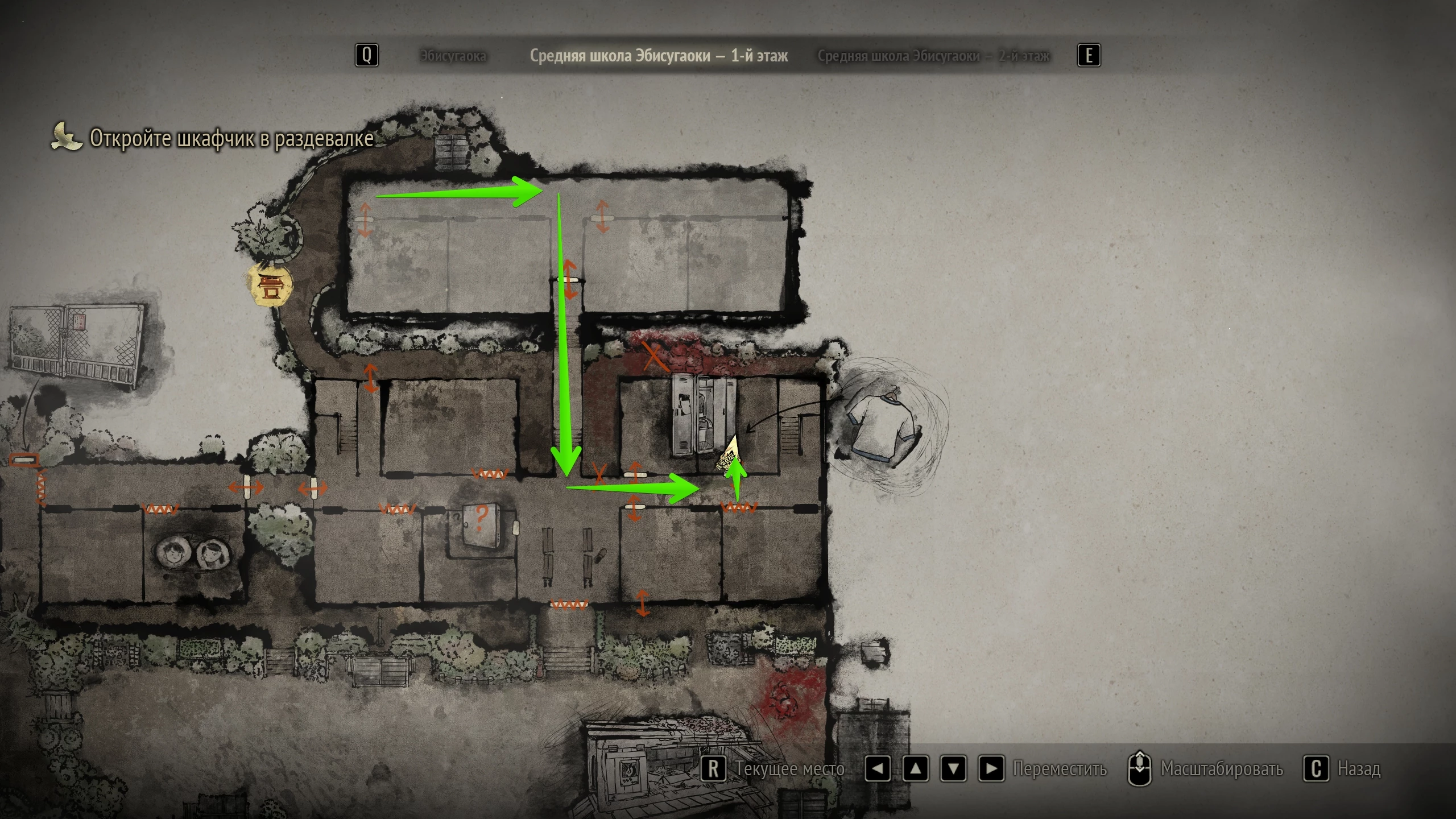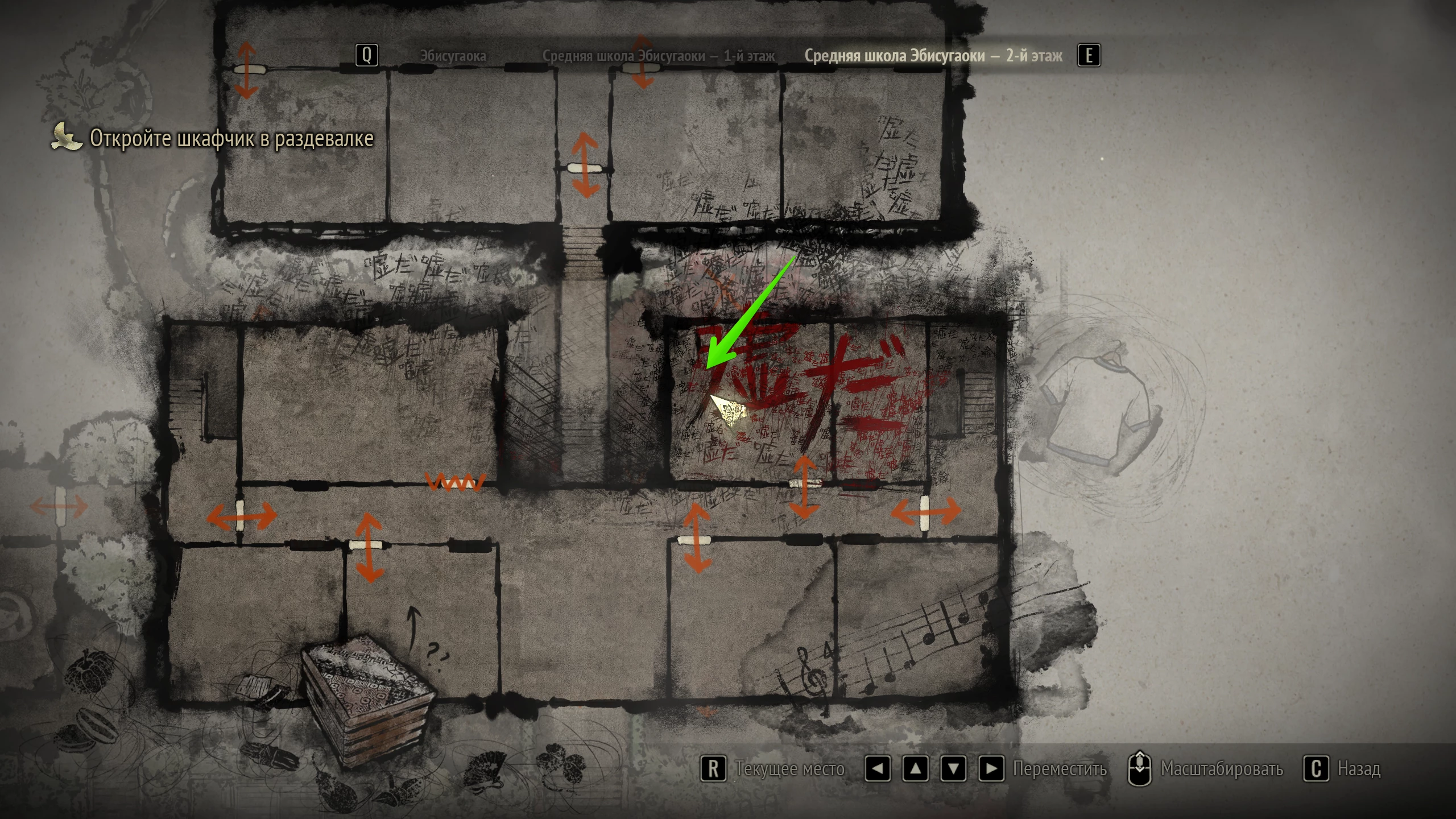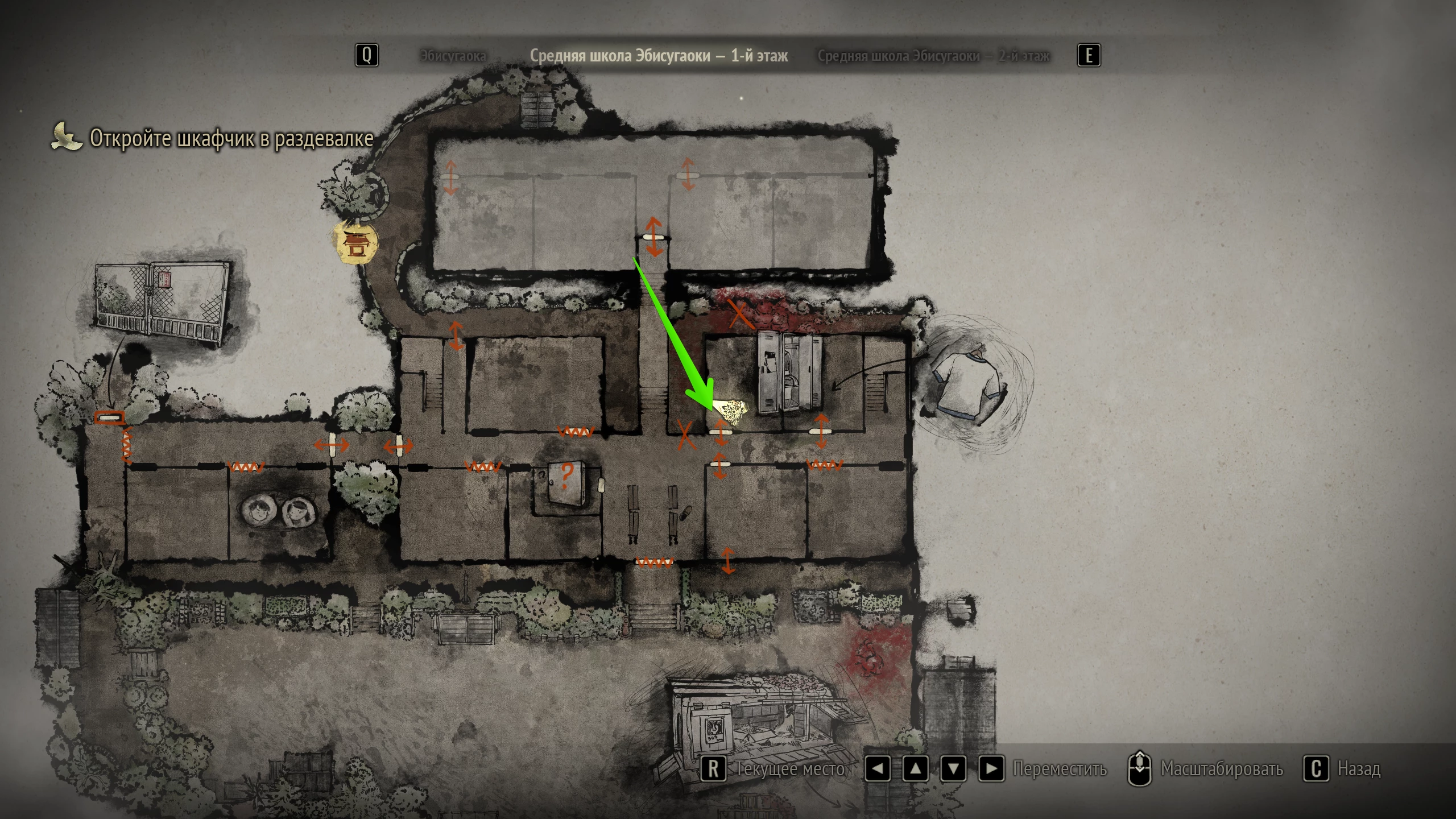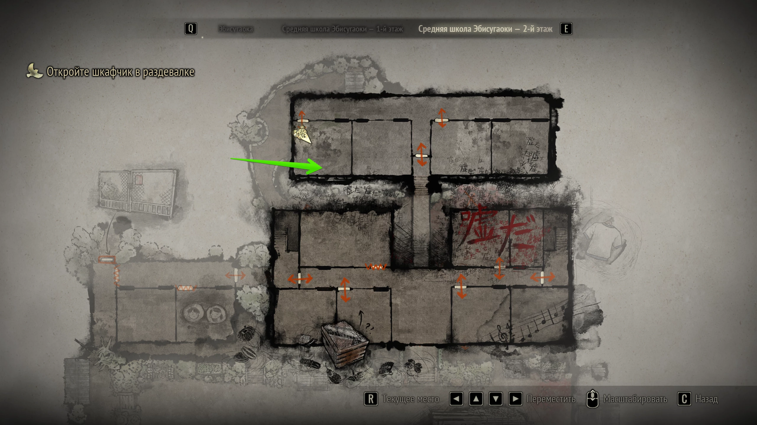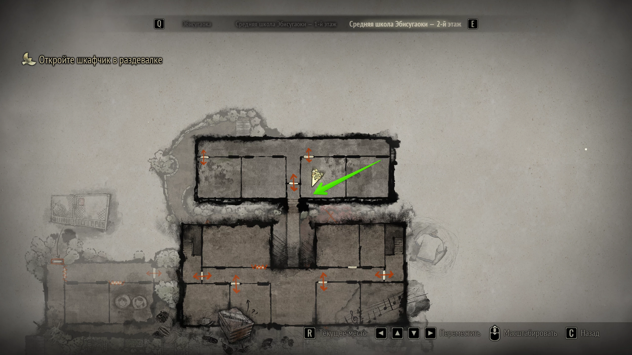 Щоб знайти підказку, вирушайте в ліву аудиторію в шкільній прибудові. Огляньте за партами стелаж і візьміть з правої верхньої осередку записку.
