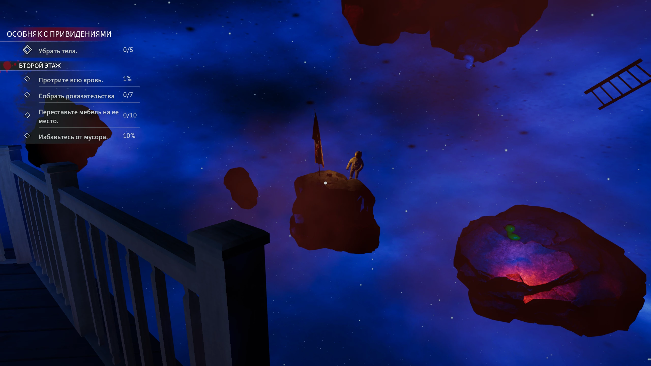 Піднімайтеся на другий поверх і заходьте в кімнату навпроти кривої картини. Підійдіть до вікна і відкрийте його, щоб вибратися назовні. Ззовні буде космос з астероїдами. Знайдіть камінь з космонавтом і прапором — біля нього знаходиться скринька. На зворотному шляху можете відкрити вікна першого поверху.