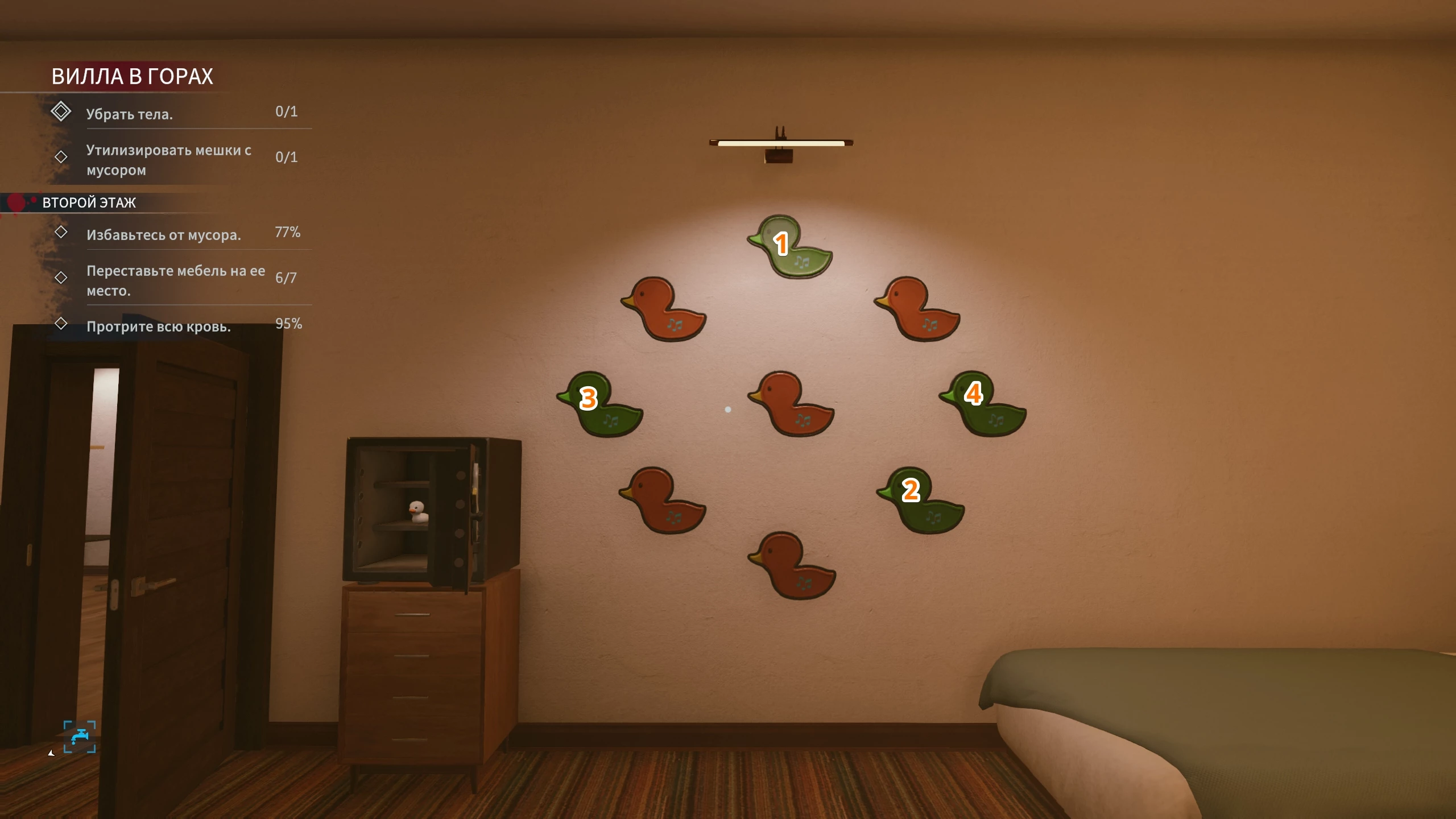 Щоб відкрити сейф, потрібно в правильному порядку натиснути на уточок на стіні. Ви можете орієнтуватися за звуками, що видаються при натисканні на сейф, або подивитися на скріншот нижче. Поклавши всіх уточок, ви отримаєте код 7-5-3-4, який можна ввести, щоб відкрити двері.