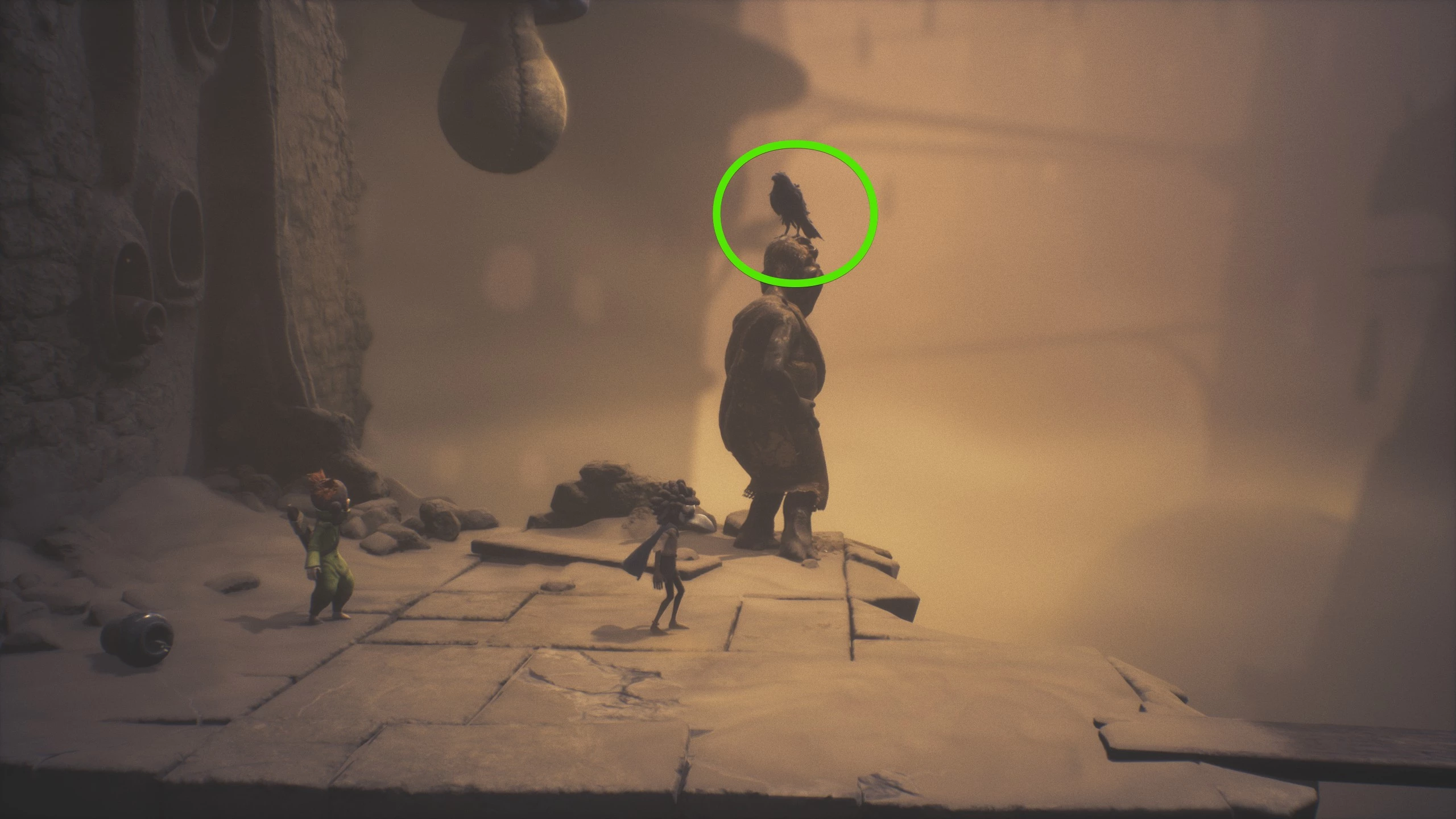Вийдіть з приміщення, де був знайдений перший ворон. Відсуньте разом з компаньйоном величезну коробку. Спустіться і подивіться на статую у прірві, на голові якої сидить птах.