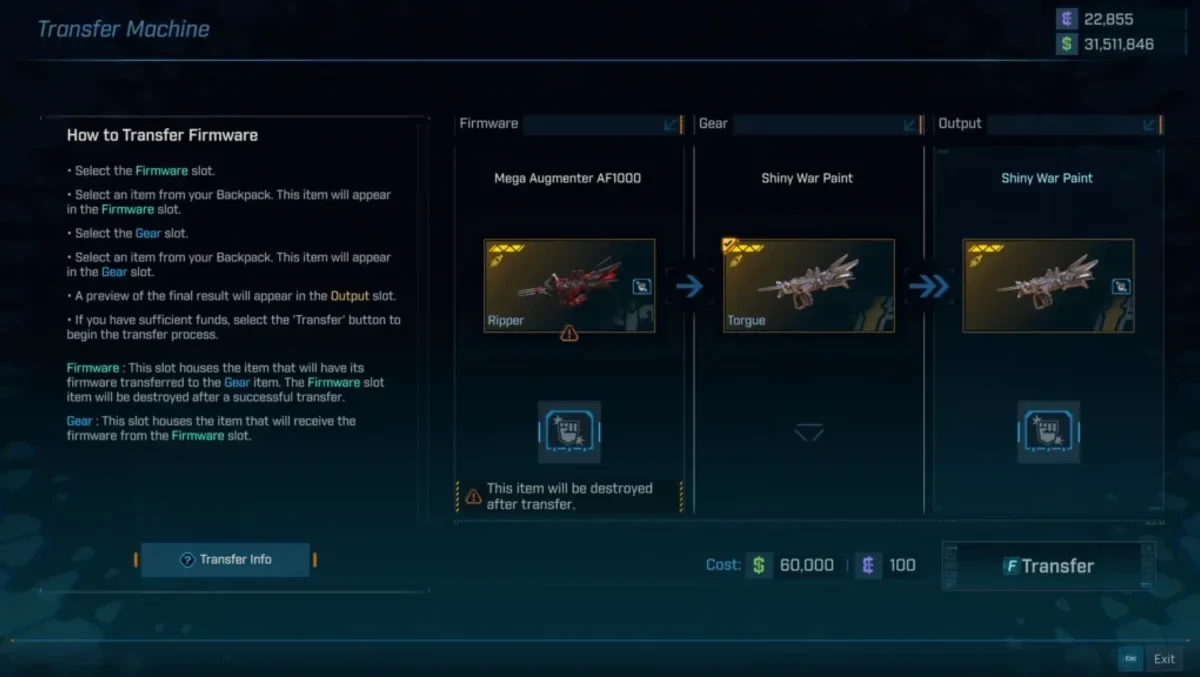Ще один спосіб витратити еридій — це перенесення прошивки. Ця нова механіка дозволяє передавати особливий бонус з одного предмета екіпіровки на інший, при цьому вихідна зброя знищується. Для перенесення прошивки знадобляться як гроші, так і злитки еридію.