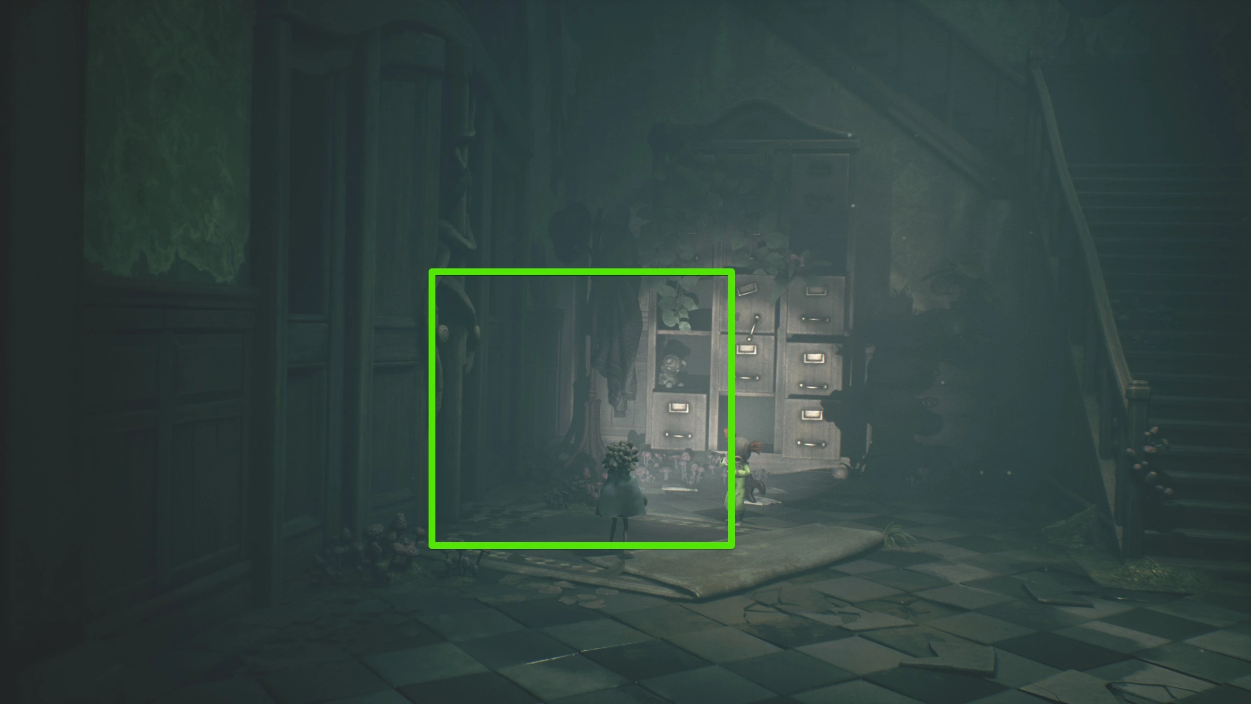 Переживіть першу зустріч з гігантською рукою. Пройдіть через грибне поле і опинитеся перед сходами, що ведуть угору. Знайдіть силует у лівому куті поруч з вішалкою.