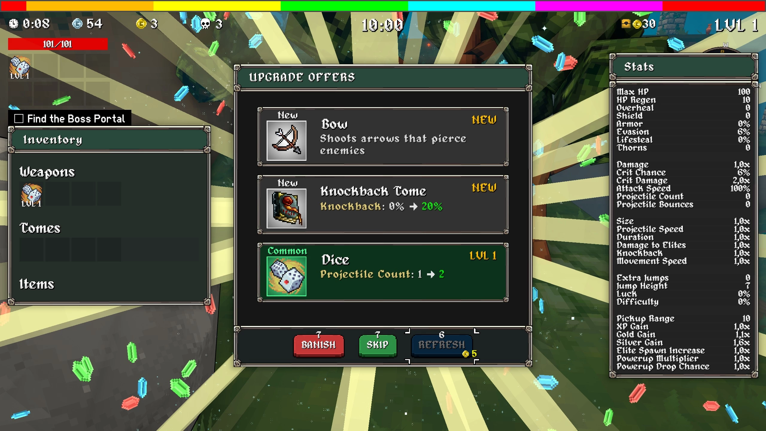З павших ворогів, глиняних горшків і перекотиполя випадають маленькі блакитні кристали досвіду. При заповненні синьої смужки вгорі екрану з'являється вікно вибору покращення фоліантів або зброї. До того як ви заповните всі слоти, там будуть випадкові книги і пушки. Зробивши вибір, підвищується певна характеристика.
