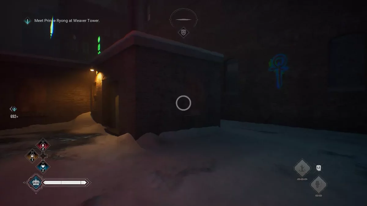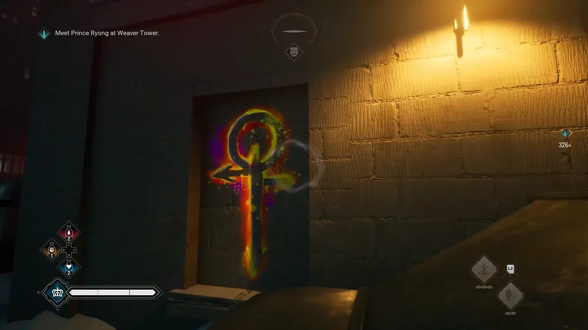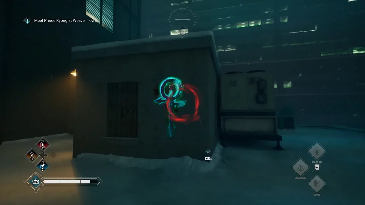 Перша мітка знаходиться праворуч від бару «Маком». Щоб дістатися до неї, доведеться залізти по стінах, використовуючи навколишні елементи. Спростити шлях можна, скориставшись вентиляційною шахтою, розташованою поруч з локацією.