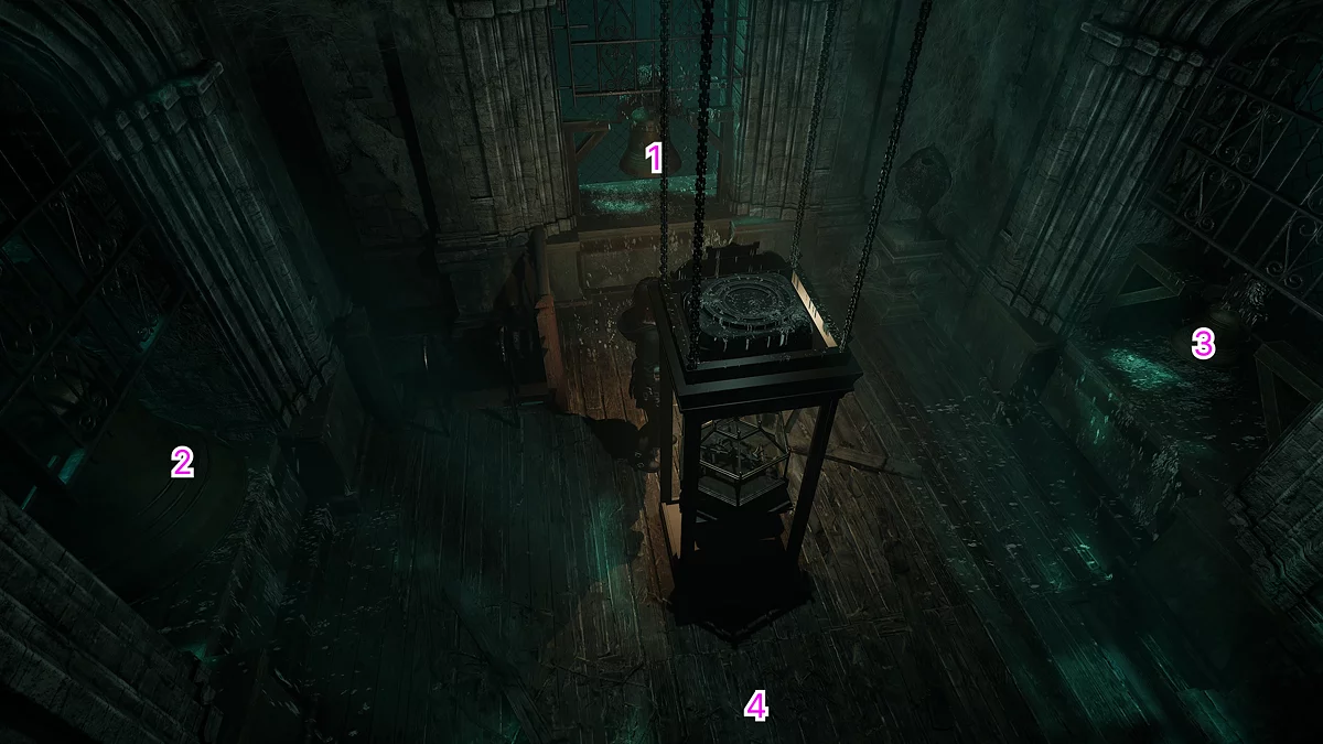 Поверніться в каплицю обителі. За допомогою молотка розбийте вази, що заважають пройти до піку будівлі. Піднявшись по сходах, виріште загадку з дзвонами: