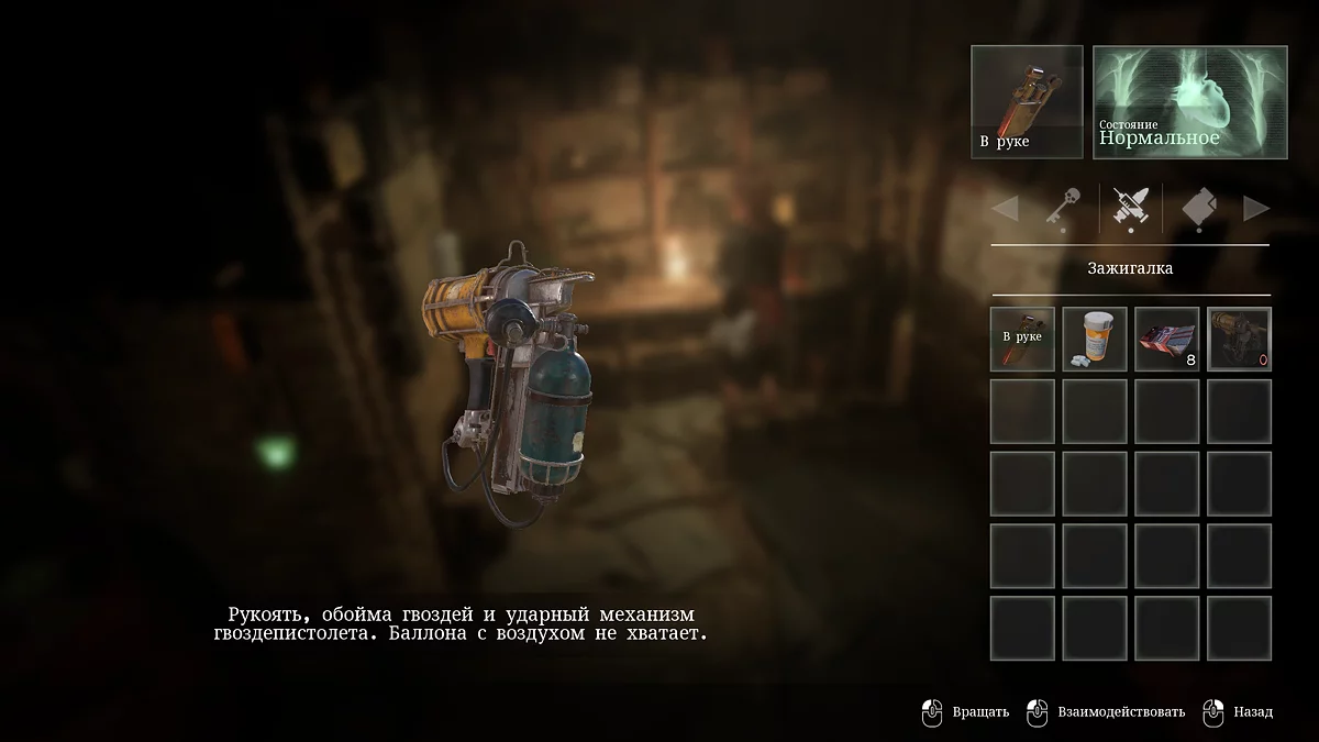 Перше доступне гравцеві озброєння можна отримати в майстерні підвалу. Після активації електроенергії спустіться на ліфті в підземну секцію і йдіть прямо, поки не наткнетеся на синю двері. Всередині знайдіть балон зі стисненим повітрям і об'єднайте його з корпусом гвоздепистолета на столі винахідника.