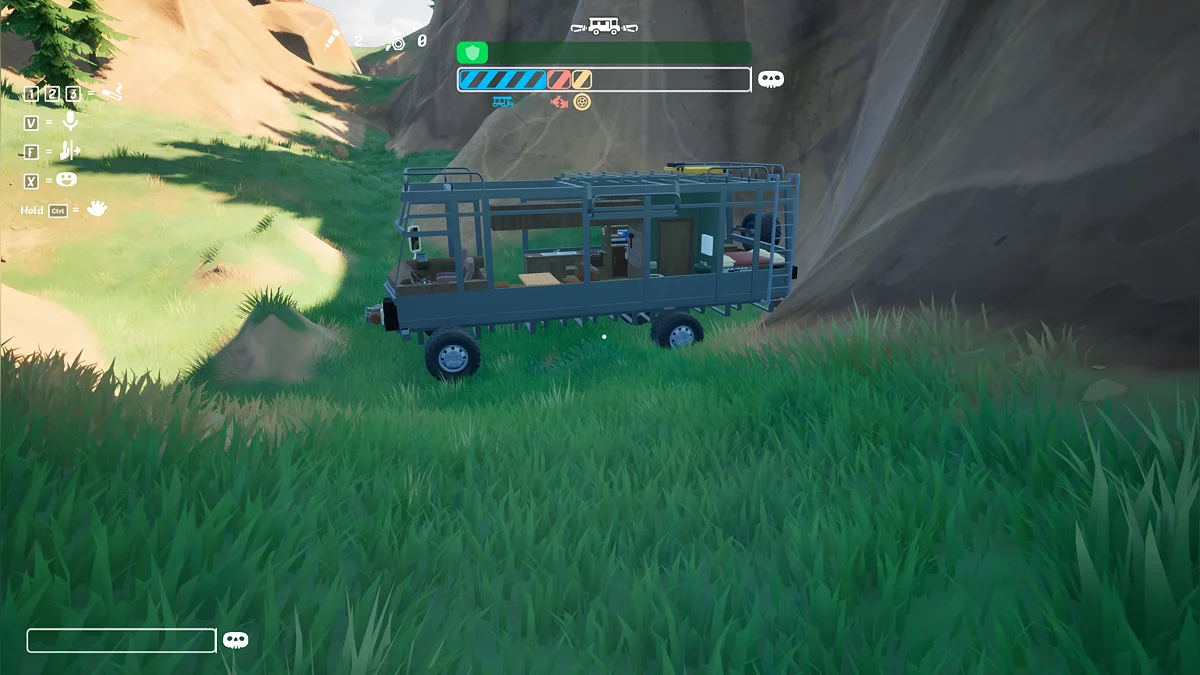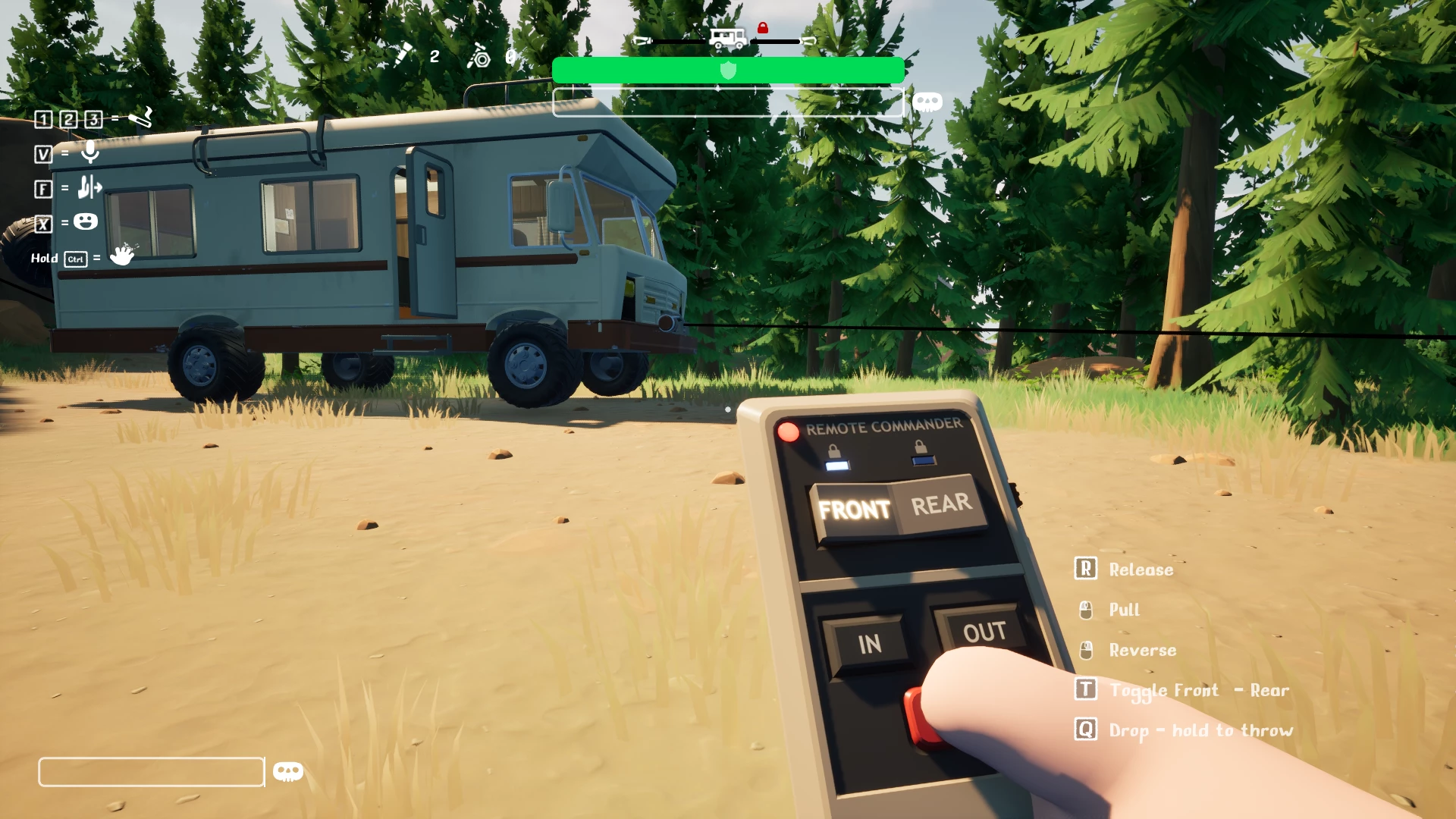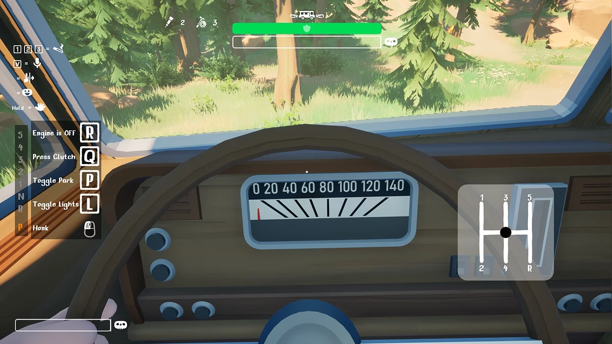 - R — вмикає і вимикає двигун. У грі немає бензину, але шум двигуна буде приваблювати місцевих тварин, тому глушіть мотор, якщо відходите від машини далеко;