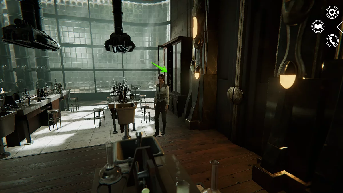 Наступний шлях лежить до лабораторії. Ввійшовши всередину, огляньте відкриту шафу зліва від входу і візьміть валик з Баррокштадта. Пройдіть до столу професора і поверніть наліво — на умивальнику лежать щипці і банка янґала-коли, їх також варто забрати.
