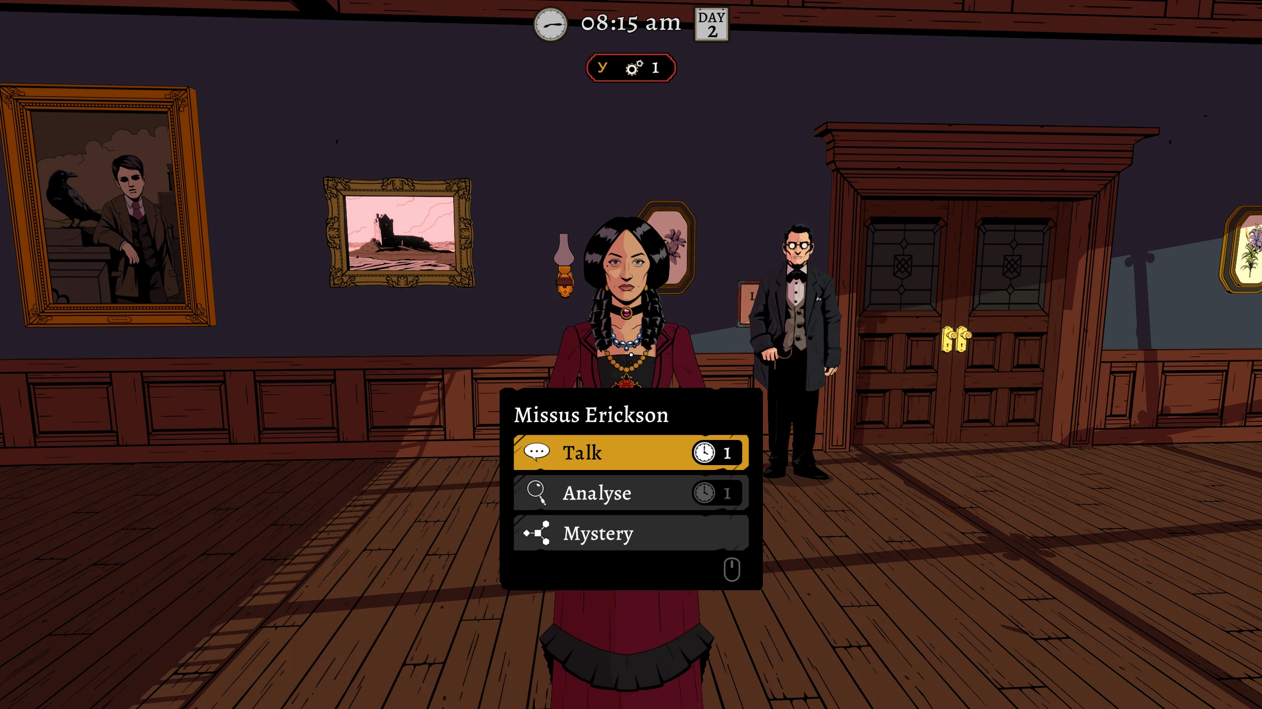 З отриманими доказами спускаємося на перший поверх до мадам Еріксон і розпитуємо її про знайдені предмети. Також аналізуємо саму персону за допомогою спеціальної опції.