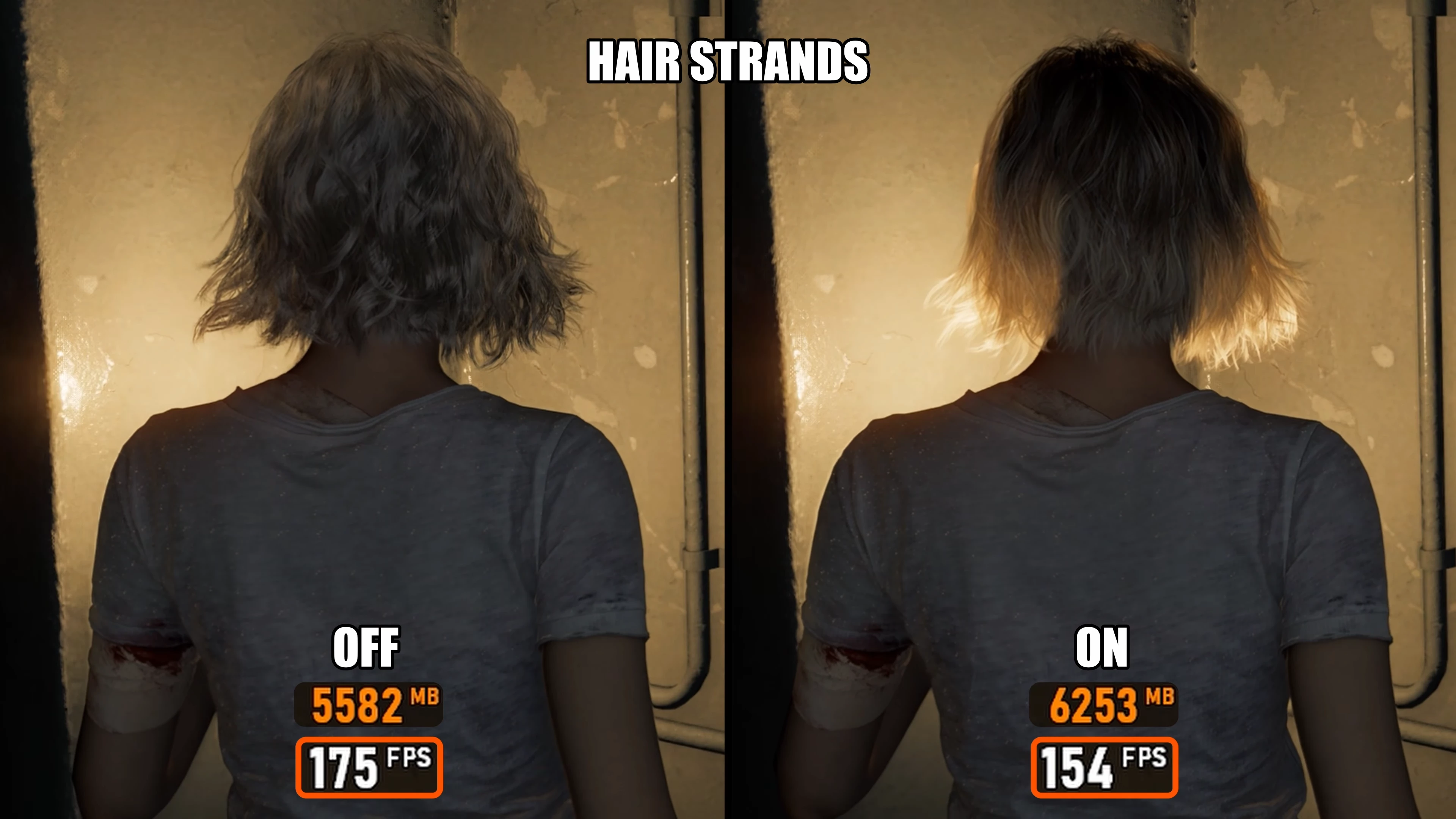Деталізація волосся споживає значно більше відеопам'яті, ніж попередні параметри. В залежності від сцени налаштування може забирати близько 10-14 FPS і додатково займати від 500 МБ до 1 ГБ відеопам'яті. З нею волосся перестають виглядати плоскими, краще реагують на освітлення і отримують більш коректні тіні. Але на відеокартах з 8–10 ГБ пам'яті це налаштування занадто вимогливе. На таких системах його краще вимкнути. На картах з більшим запасом VRAM його можна залишити ввімкненим, якщо ви готові до відповідних витрат ресурсів.