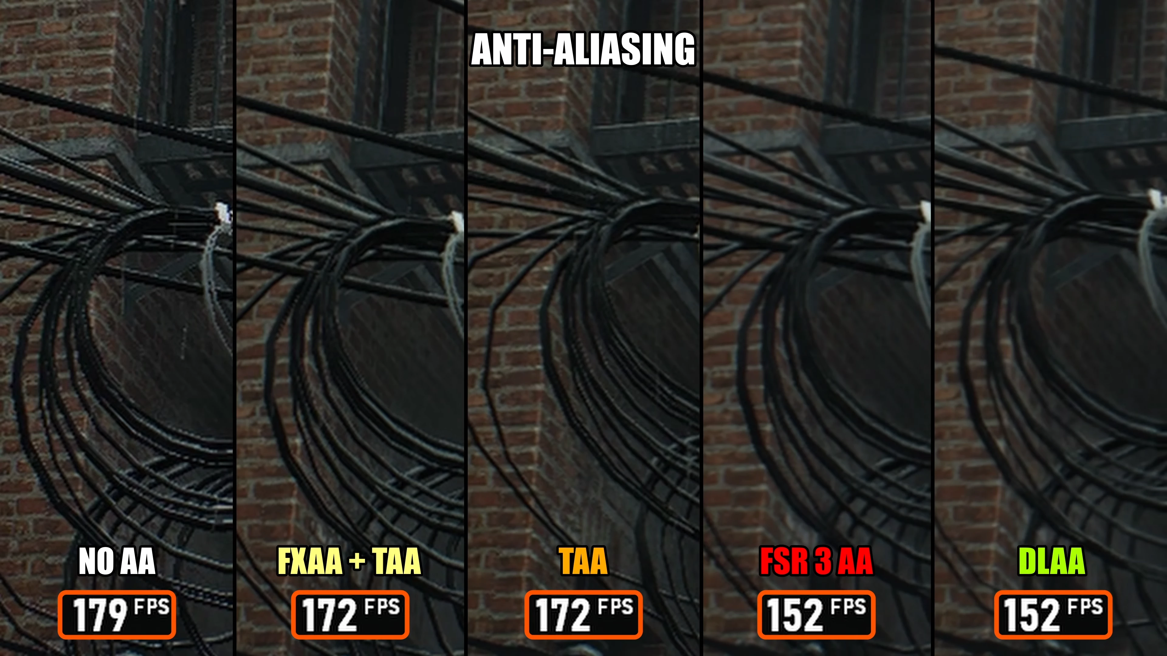 Якщо гра запущена в нативному розширенні, найбільш стабільний результат дають DAA та FSR 3 Native AA. TAA або FXAA плюс TAA дають близько 15 додаткових кадрів, але помітно розмивають зображення. Повне вимкнення згладжування підвищує FPS ще більше, але картинка швидко стає шумною та нестабільною.