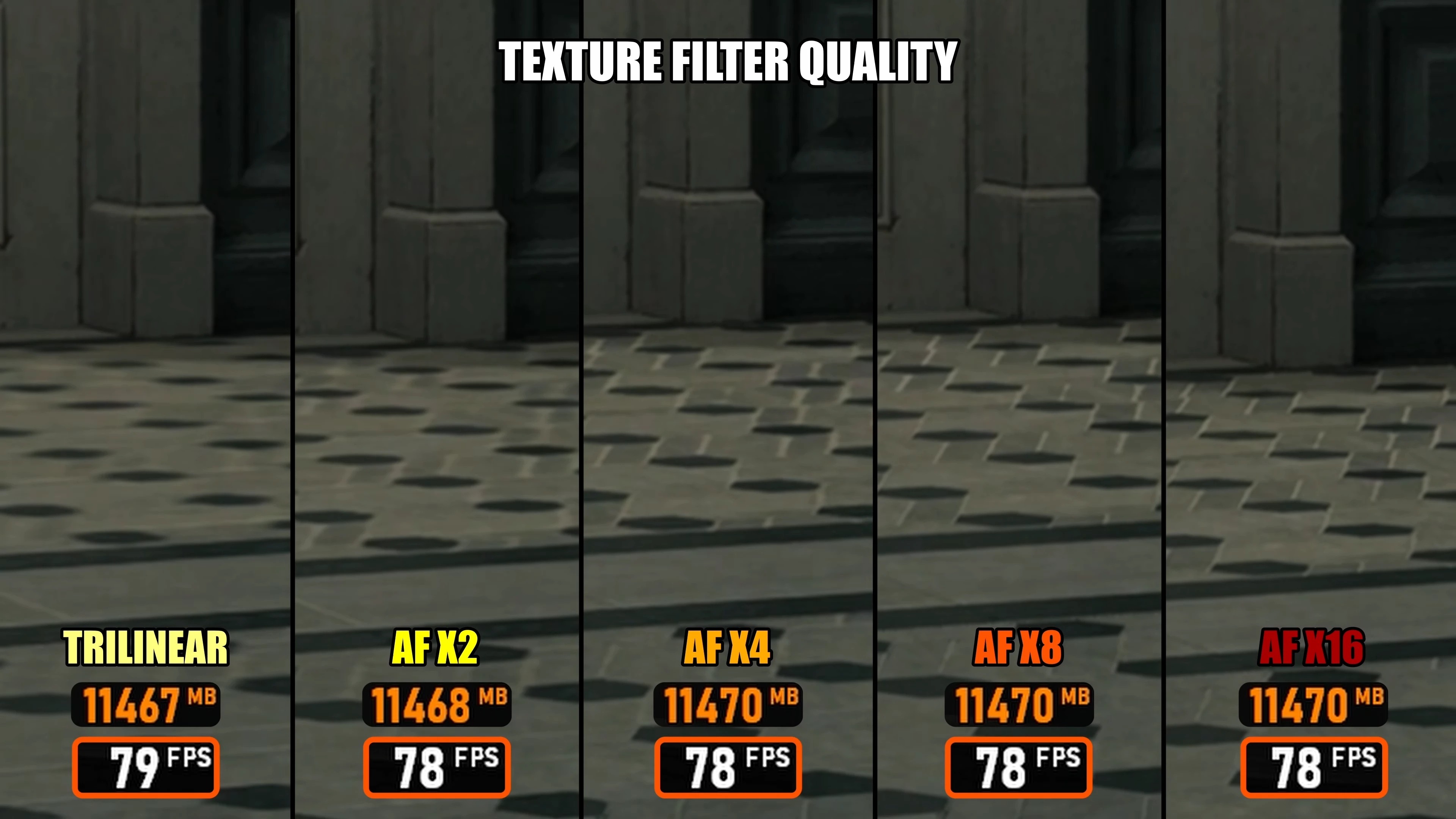 Якість фільтрації текстур практично не впливає ні на FPS, ні на VRAM. Оскільки йдеться про анізотропну фільтрацію, її має сенс тримати на AF8 або AF16. Такий параметр покращує чіткість текстур під кутом і на відстані, не створюючи помітного навантаження на систему.