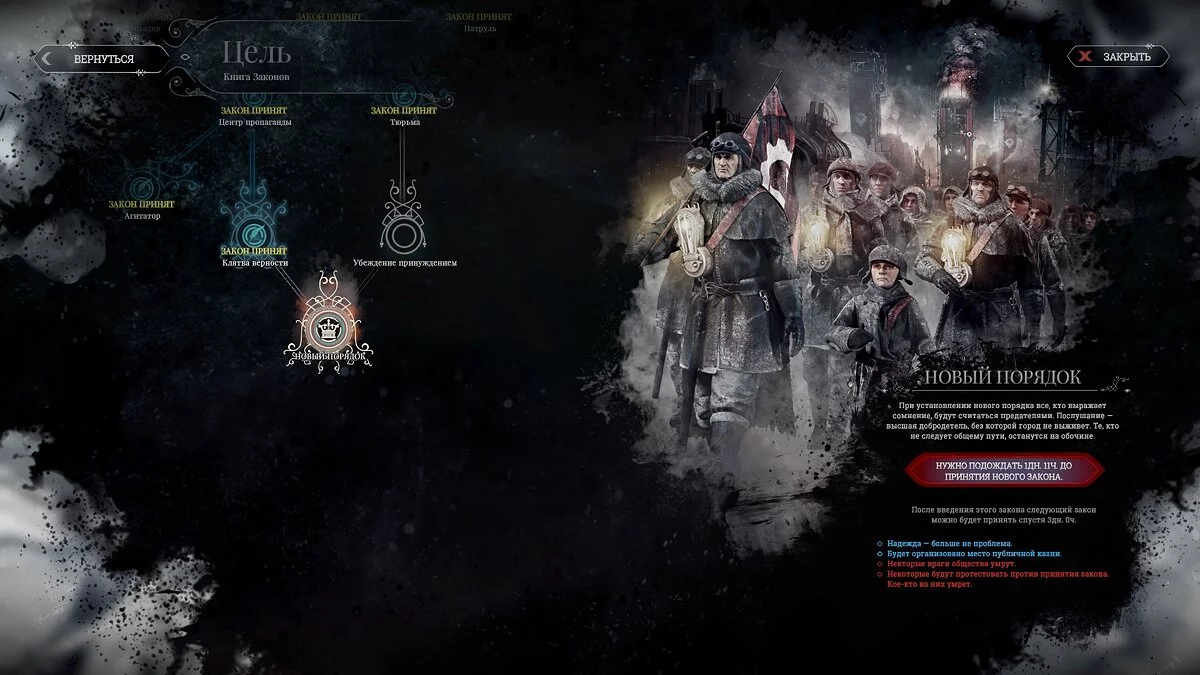 Задача игрока — не контролировать, а постоянно накапливать надежду, поэтому принятие некоторых законов стоит попридержать до критических ситуаций, а они возникнут, об этом ниже. Помните, что надежда падает сильно, от четверти до половины шкалы, а растет маленькими шагами, поэтому стремитесь поддерживать её выше середины шкалы.