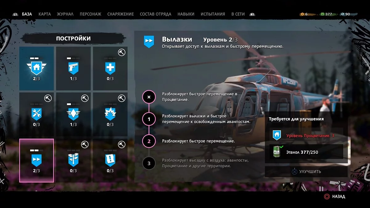 Третье, финальное обновление, также возможно после улучшения базы группировки до предела. За 250 единиц этанола вы сможете десантироваться в любое место на карте. Да, прямо обнаружите себя парящим в воздухе, будто в какой-то «королевской битве» и сможете лететь в любое место — не забудьте вингсьют для планирования!