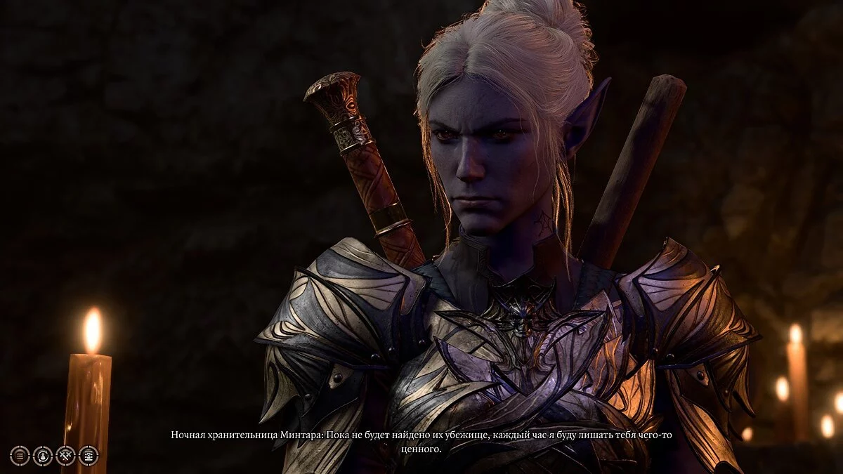 - После любовной сцены Минтара попытается убить главного героя. Используйте запугивание, чтобы убедить дроу отступить.