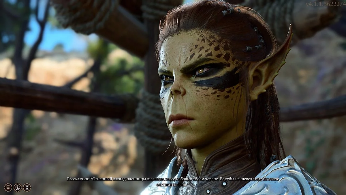 Продолжайте двигаться вверх по тропе от рунного камня, где нашли Гейла. Вы увидите, как в ущелье два тифлинга держат в ловушке старую знакомую Лаэзель. Пройдите проверку на обман, тем самым убедив незнакомцев идти дальше и не обращать внимание на пленницу. Освобождаем гитьянку, выстрелив в дно ловушки. Если стрелкового оружия не в наличии, то бросьте любой предмет или камень. Пообщайтесь с Лаэзель и согласитесь отправиться в ясли, чтобы избавится от паразита. Берем гитьянку к себе в команду.