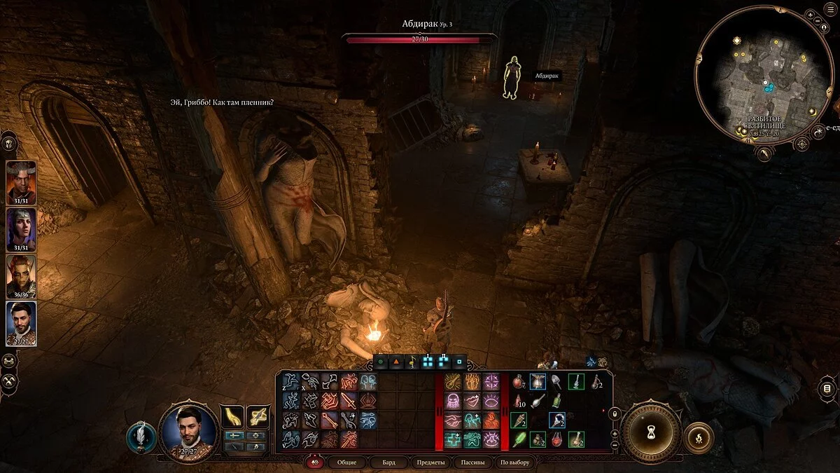 Слева от Абдирака будет проход с клеткой, в которой сидит бард. Поговорите с Гриббо и проберитесь в ее голову через способность иллитида. Далее выберите первый вариант в диалоге, где глава культа будет недовольна пленников. Гоблинша отдаст ключ от клетки. Освободите пленника и уговорите его отправится в ваш лагерь.