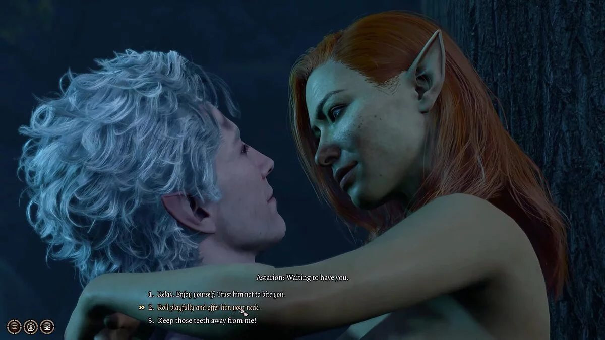 После спасения тифлингов отправляйтесь в лагерь для празднования победы. Начните диалог с Астарионом и согласитесь на его предложение «развлечься». Ложитесь спать и выбирайте опцию с вампиром.