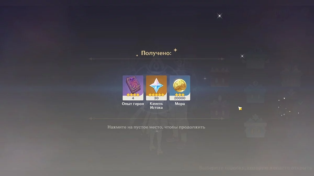 - Коробка с чудесами (Гидро): Камни Истока (40), Опыт героя (8), Мора (20 000);