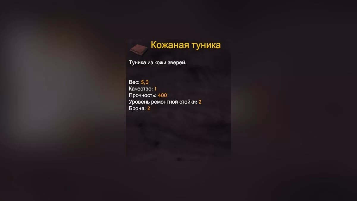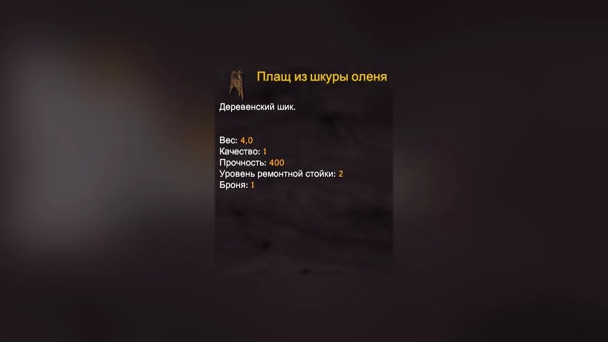 - Ресурсы для изготовления: шкура оленя (6 шт.).
