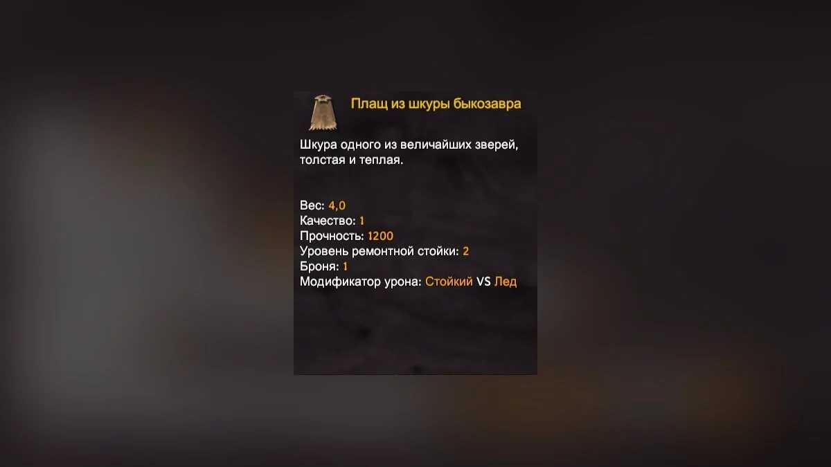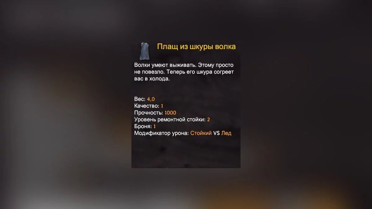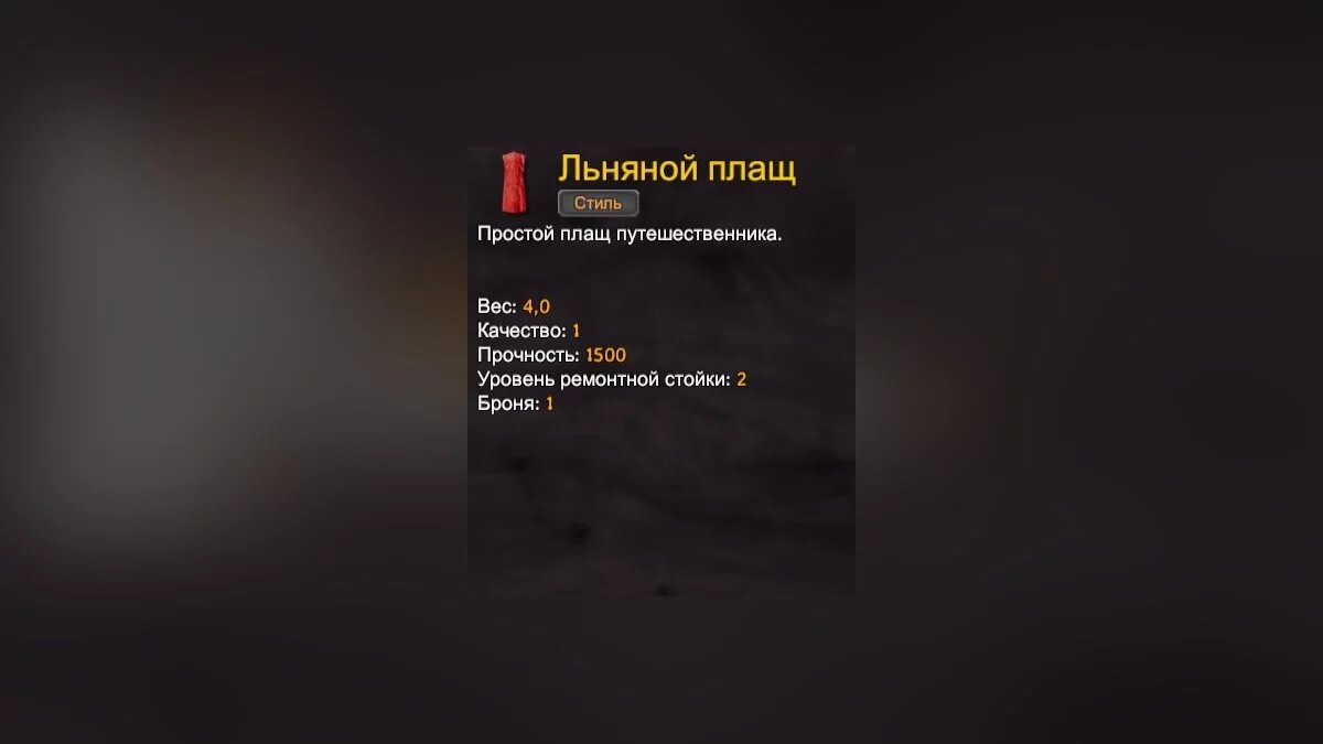 Заключительный элемент экипировки — плащ. Его основное предназначение — защита от холода, брони он почти не даёт.
