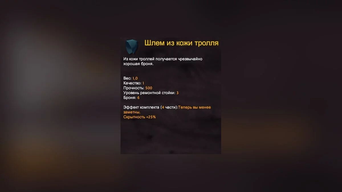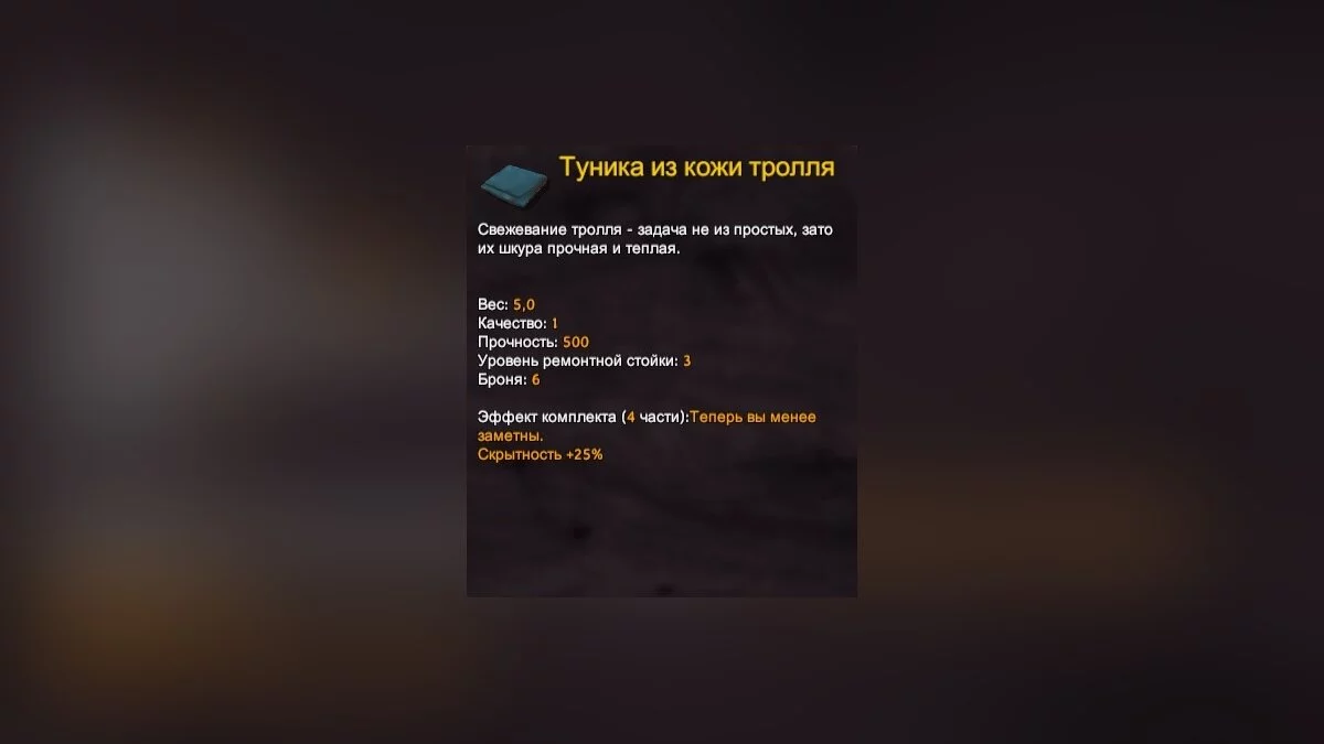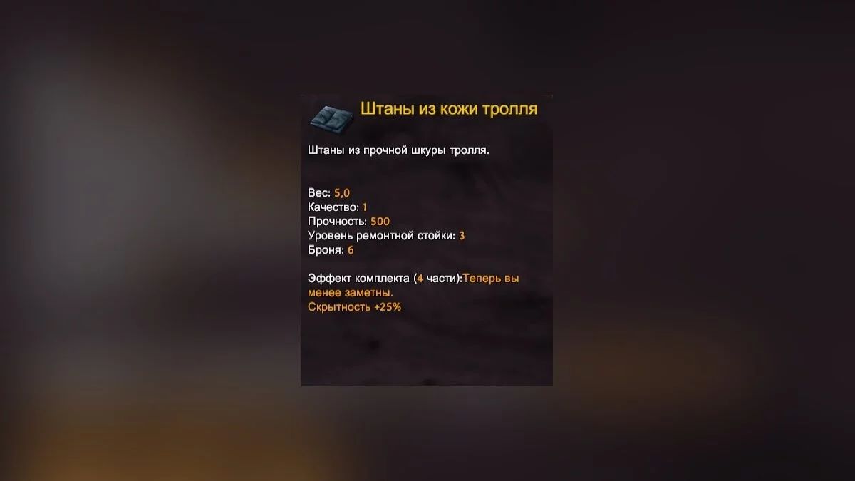 - Ресурсы для изготовления: шкура тролля (5 шт).