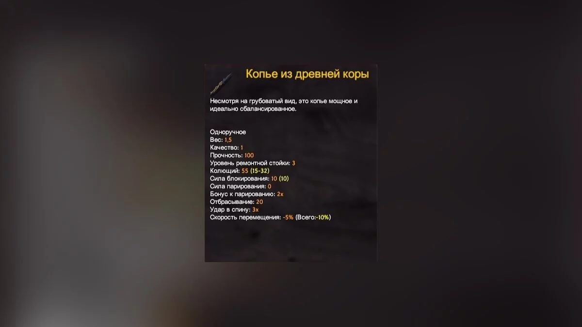 Одноручное оружие, наносит колющий урон. Незначительно замедляет персонажа (на 5%). Обратите внимание, копьями нельзя парировать атаки, поэтому старайтесь использовать их вместе с щитами с параметром парирования.