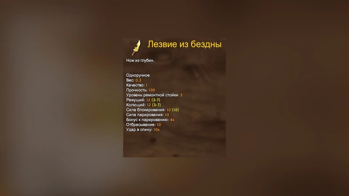Одноручное оружие, используется для скрытных атак, наносит колющий и режущий урон. Не замедляет персонажа. Имеет самый большой модификатор удара в спину (х10).
