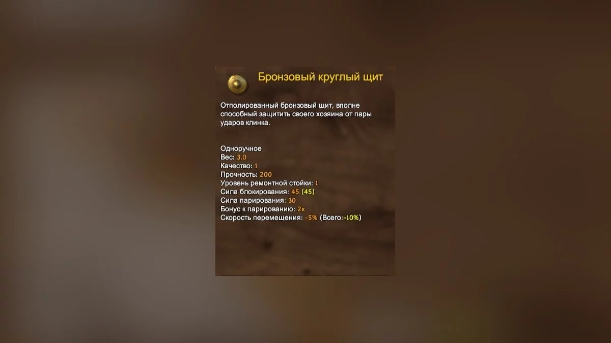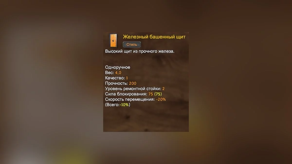 Позволяет блокировать/парировать атаки, может значительно замедлять персонажа (от 5 до 20%).
