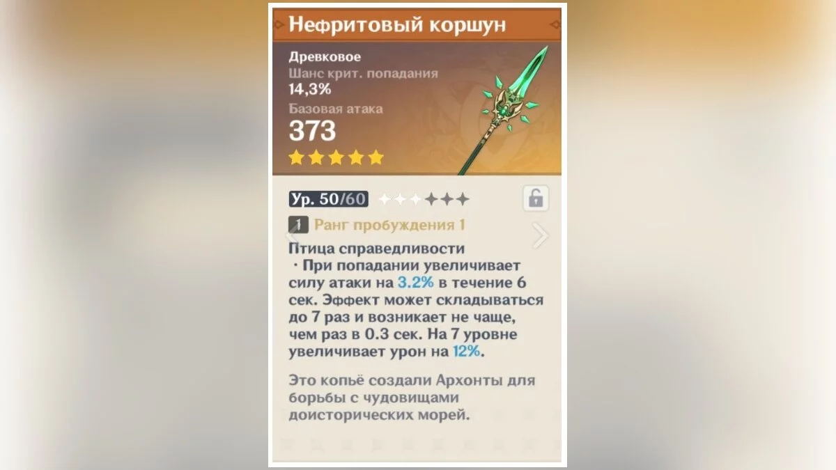 - Нефритовый коршун (копьё). В течение 6 секунд сила атаки увеличивается на 3.2/3.9/4.6/5.3/6% при попадании в противника. Эффект возникает не чаще одного раза в 0,3 секунды и до 7 раз.