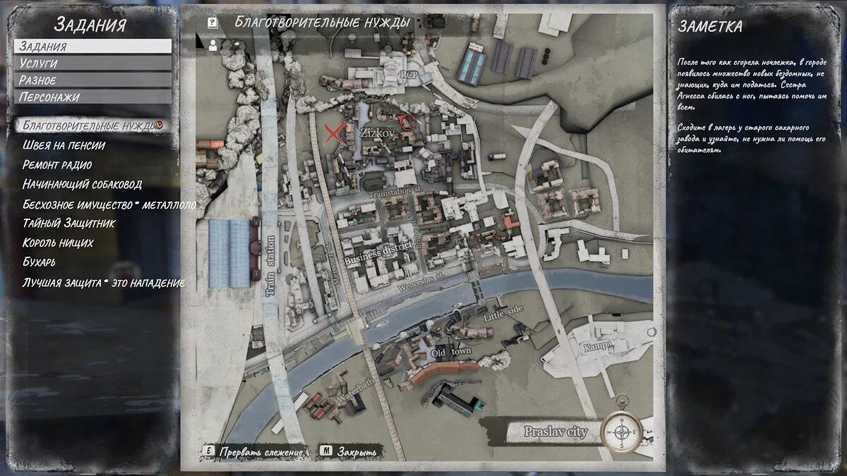 Один из бездомных страдает бессонницей и не может уснуть в палатке. Вам нужно отыскать для него ночлег. Сперва следует обратиться к сестре Агнессе, благотворительный дом которой находится на востоке Жижкова.