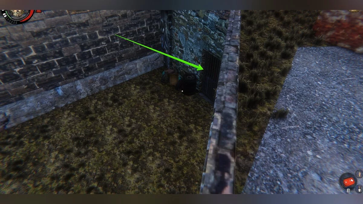 На самом деле попасть сюда проще из бара, где обитает Барон. Поднимитесь по каменной лестнице и пройдите к бару с Бароном. Сразу за баром вы увидите парапет, за которым небольшой спуск. Прыгайте вниз, посмотрите вправо. Здесь вы увидите металлическую решётку. Это и есть вход в канализацию.