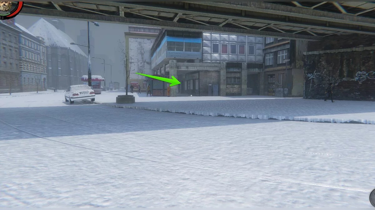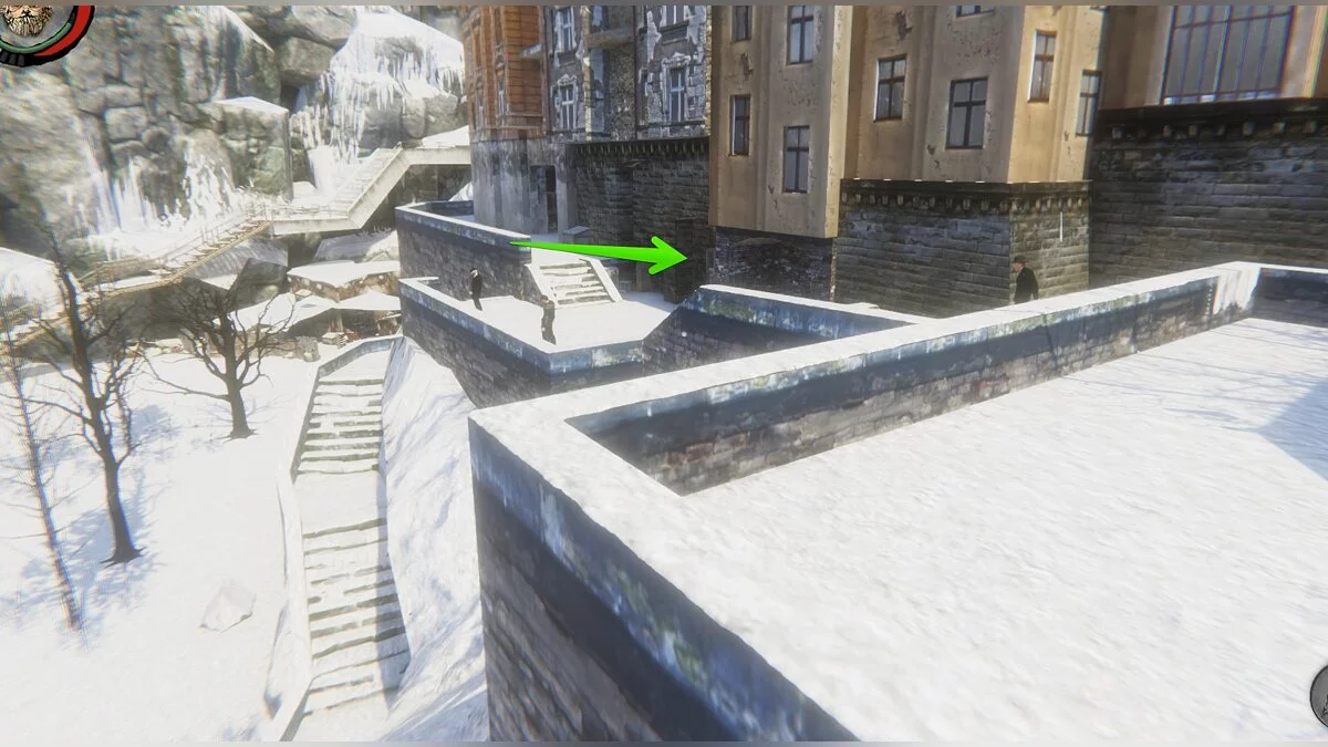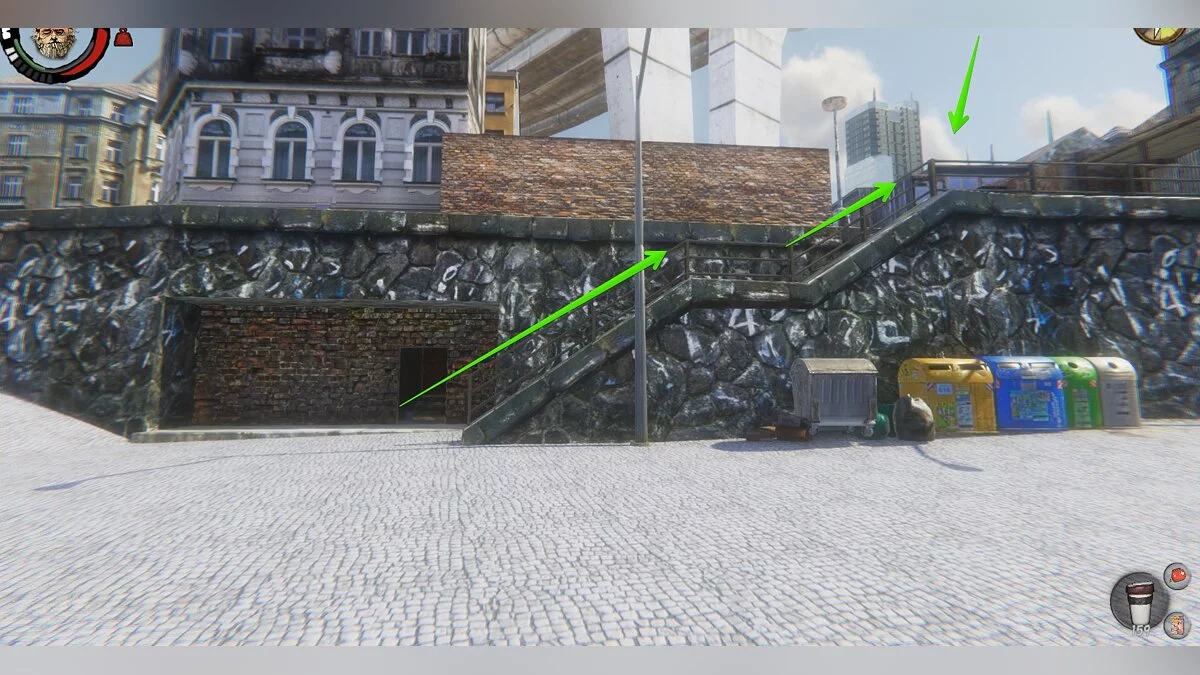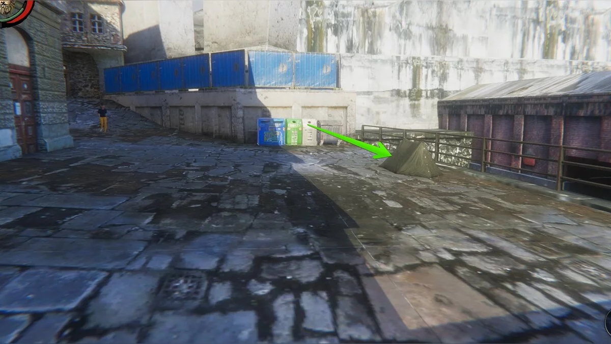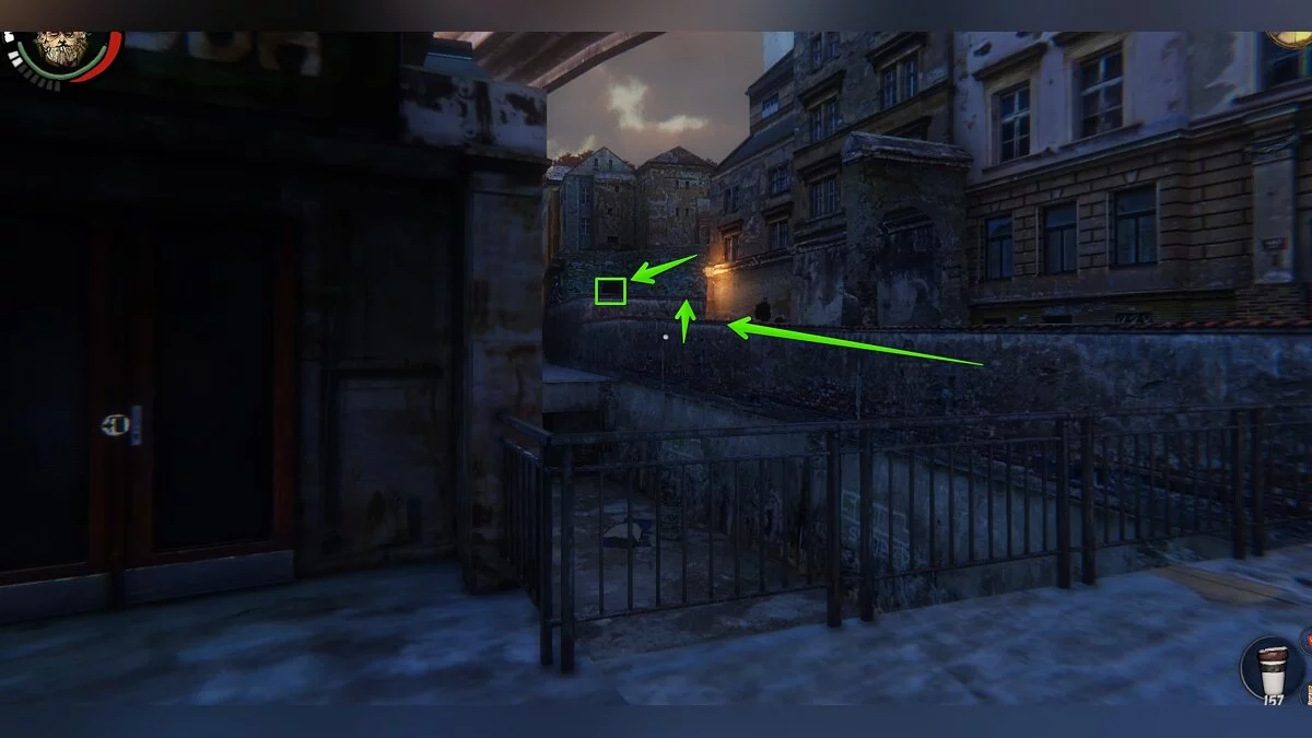 Если же вы двигаетесь по центральной улице, то вам нужно добраться до церкви. Обойдите здание с левой стороны и поднимитесь на возвышенность. У Форта сверните направо и бегите вперёд до самого конца. Слева вы увидите кальянную, справа от которой есть небольшой мост и тупиковый проход. Доберитесь до тупика, запрыгивайте на мусорные баки и откройте металлическую решетку.