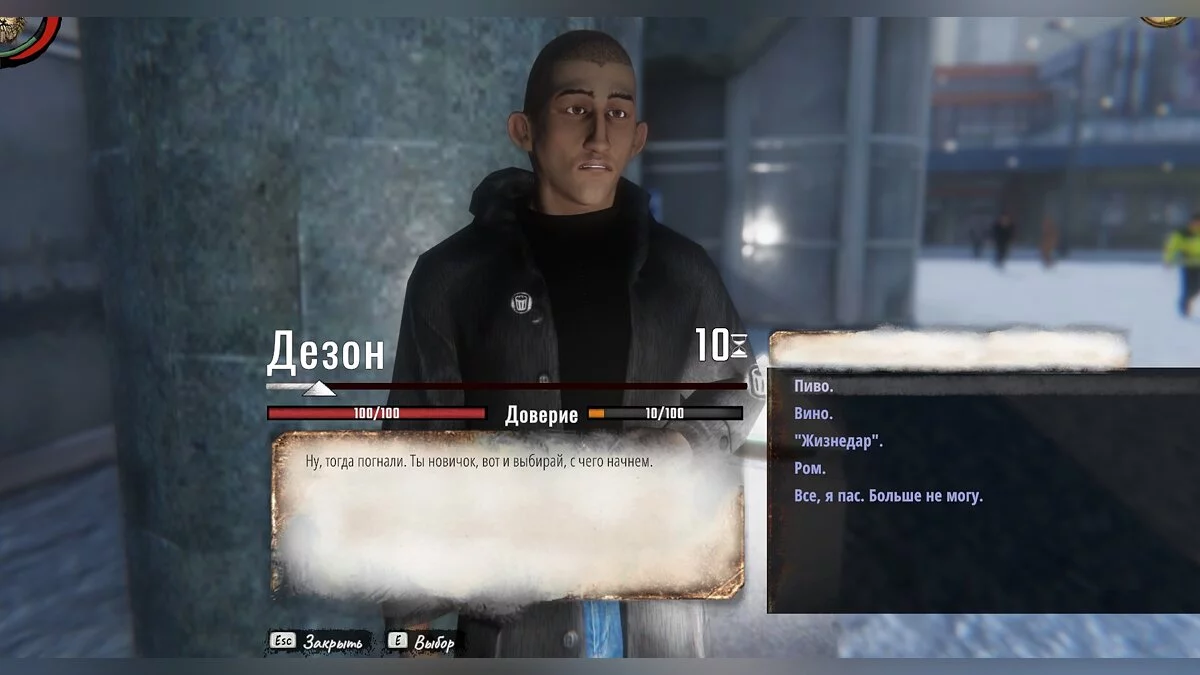 Медведь откажется разговаривать с вами, поэтому, по пути стоит заглянуть в бар и захватить несколько банок пива. С этого момента вам регулярно стоит навещать нового приятеля и выполнять его небольшие поручения. Одним из основных заданий Медведя станет квест «Снова в седле», в завершение которого персонаж отдаст вам своё пальто.