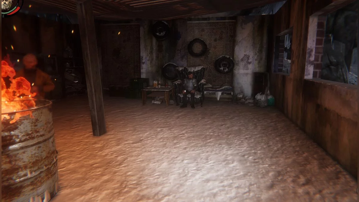 На следующий день проведайте погорельца и спросите о его самочувствии. Так как ему не стало лучше, вам следует поискать другой ночлег. Поговорите с Медведем, бездомным, который живёт рядом с Фортом приличных людей. Он расскажет о подсобке, в которой можно спать. Она находится неподалёку.