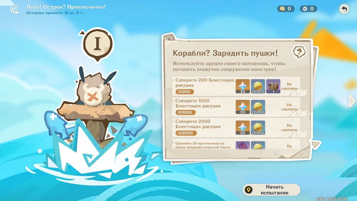Откройте меню событий, выберите раздел «Лето! Остров? Приключение!» и нажмите «Описание события». В открывшемся окне выберите доступное испытание и нажмите «Начать испытание».