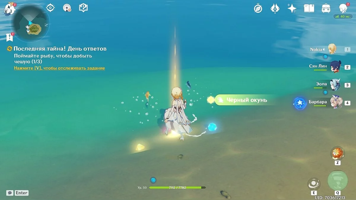 Как только квест станет доступен в вашем журнале задач, вернитесь на остров к своим друзьям и отдохните до раннего утра (выберите 06:00 в меню Паймон). После диалога с Джинн вам нужно поймать три рыбы на берегу океана, чтобы добыть чешую. Используйте кристаллы, чтобы приманить рыбу и подобрать её.